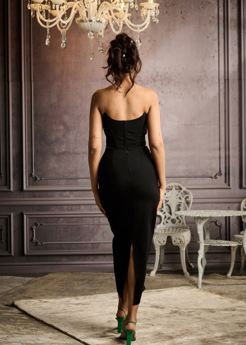 Dare to be Different in our Elizabeth Black Crystal Hand-Embellished Midaxi Skirt. A symphony of style and sophistication, she's here to elevate your wardrobe. Crafted from the finest black neoprene, Elizabeth boasts a sleek, straight midaxi silhouette that's both modern and timeless. Her high-rise fit with intricate hand-embellishments accentuates your curves, while the daring back slit adds a touch of intrigue.