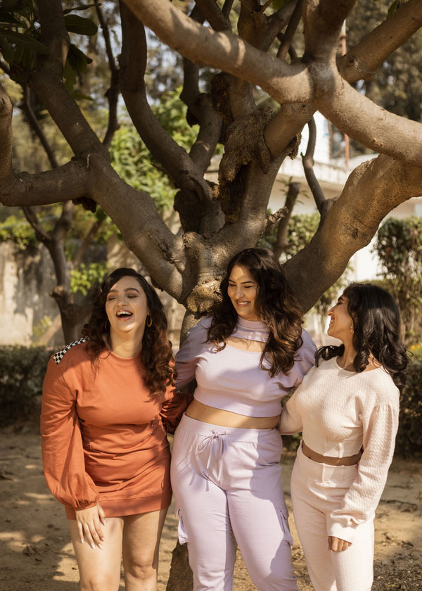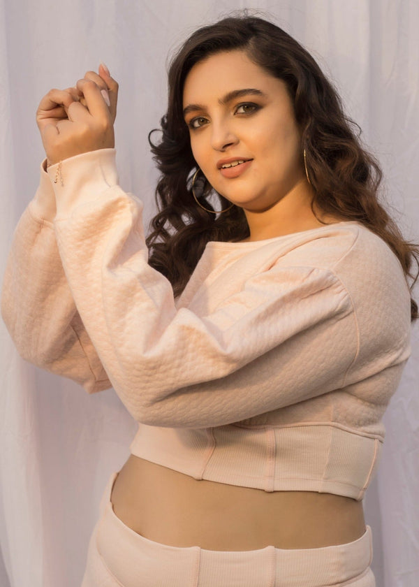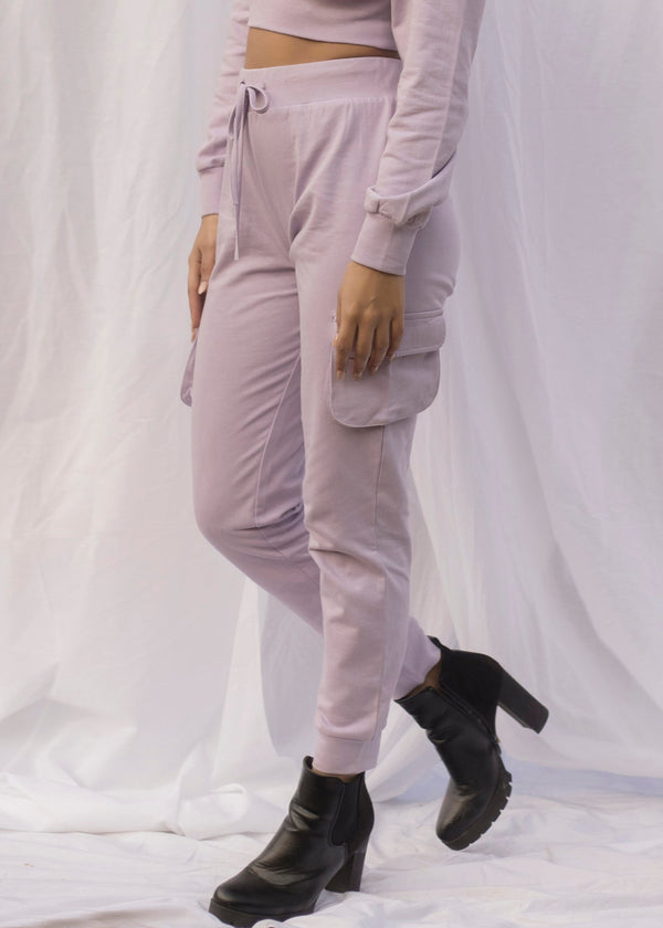 Nerea White Rib Off-Shoulder Asymmetrical Top and Khaki Fleece Embellished Pants Set