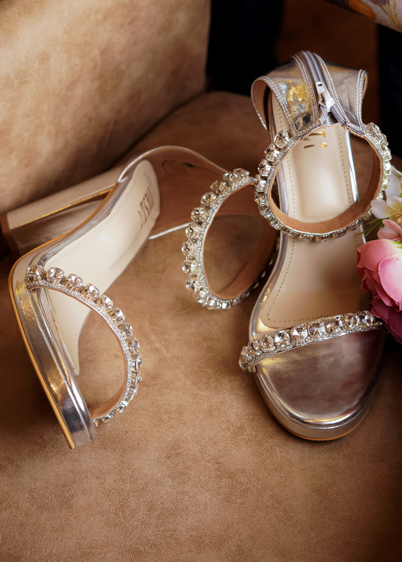 4. Kash Ankle Strap Heels from Tiesta: You’ll be the belle of the ball in these stunning shoes. Beautiful white and silver stones and pearl, silver suede high heels ankle strap.