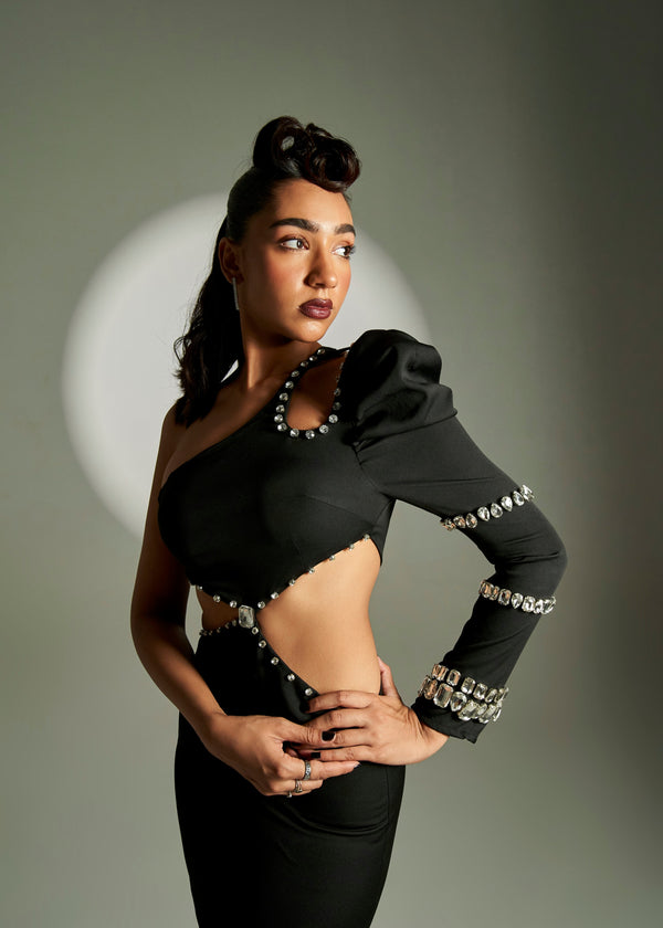 Airi Black Embroidered Rhinestone and Feather Corset Mini Dress