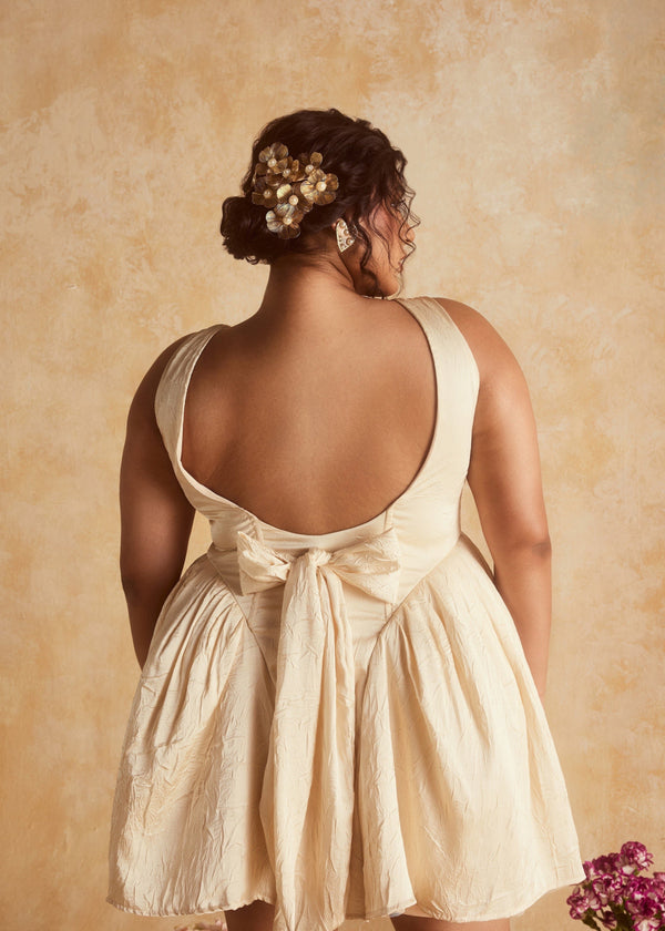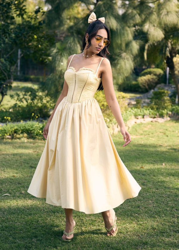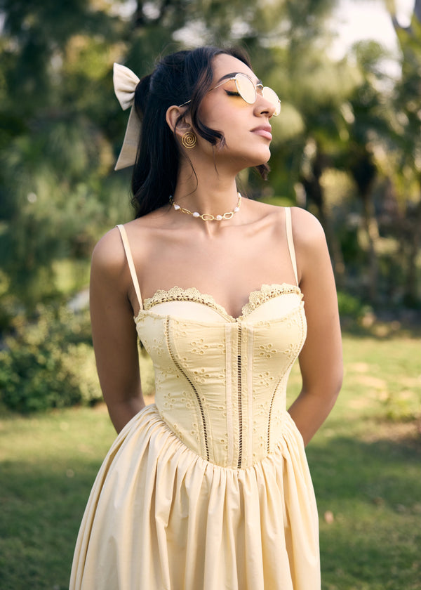 Albina Butter Yellow Satin Cutout Dress with Bead Chain