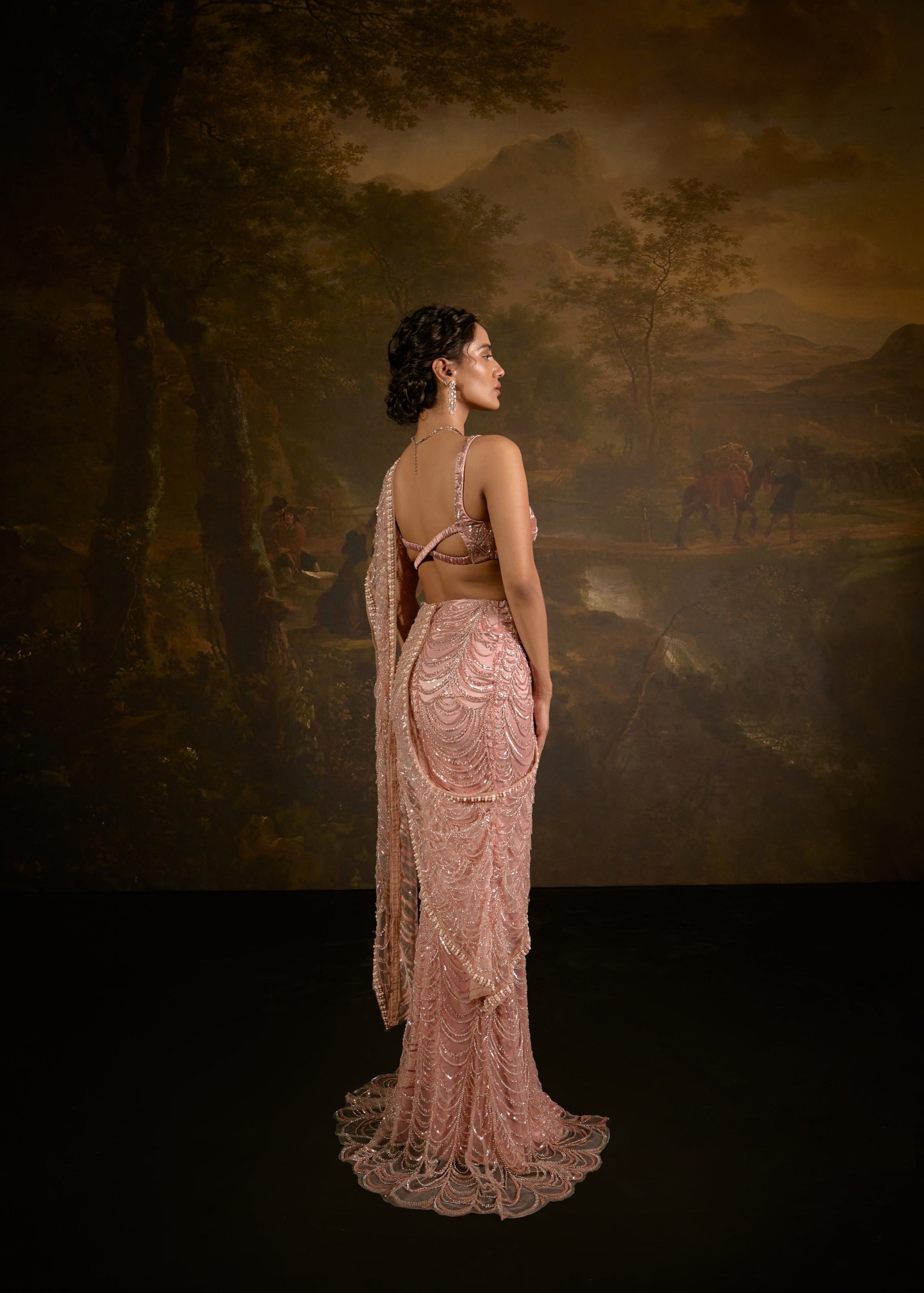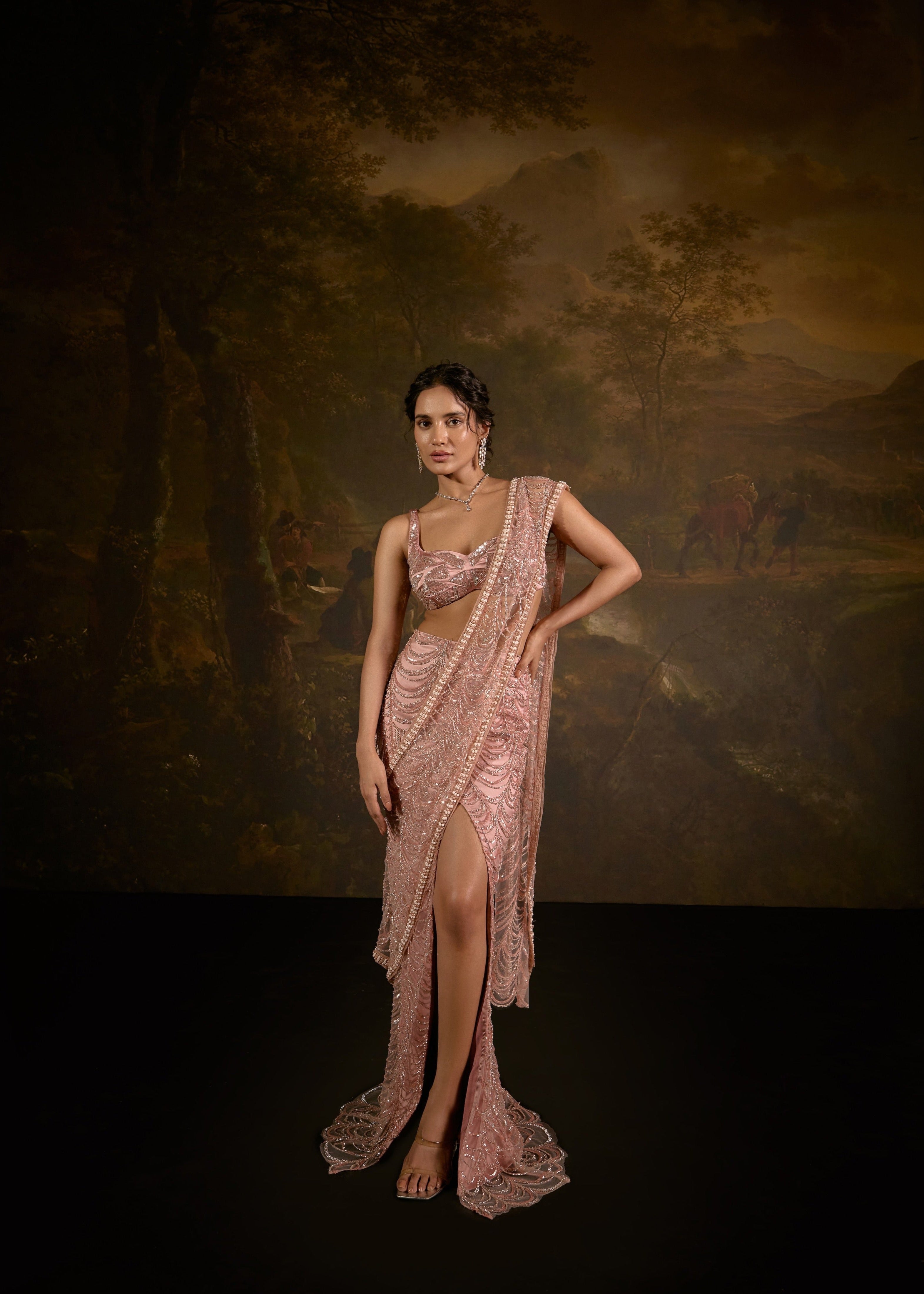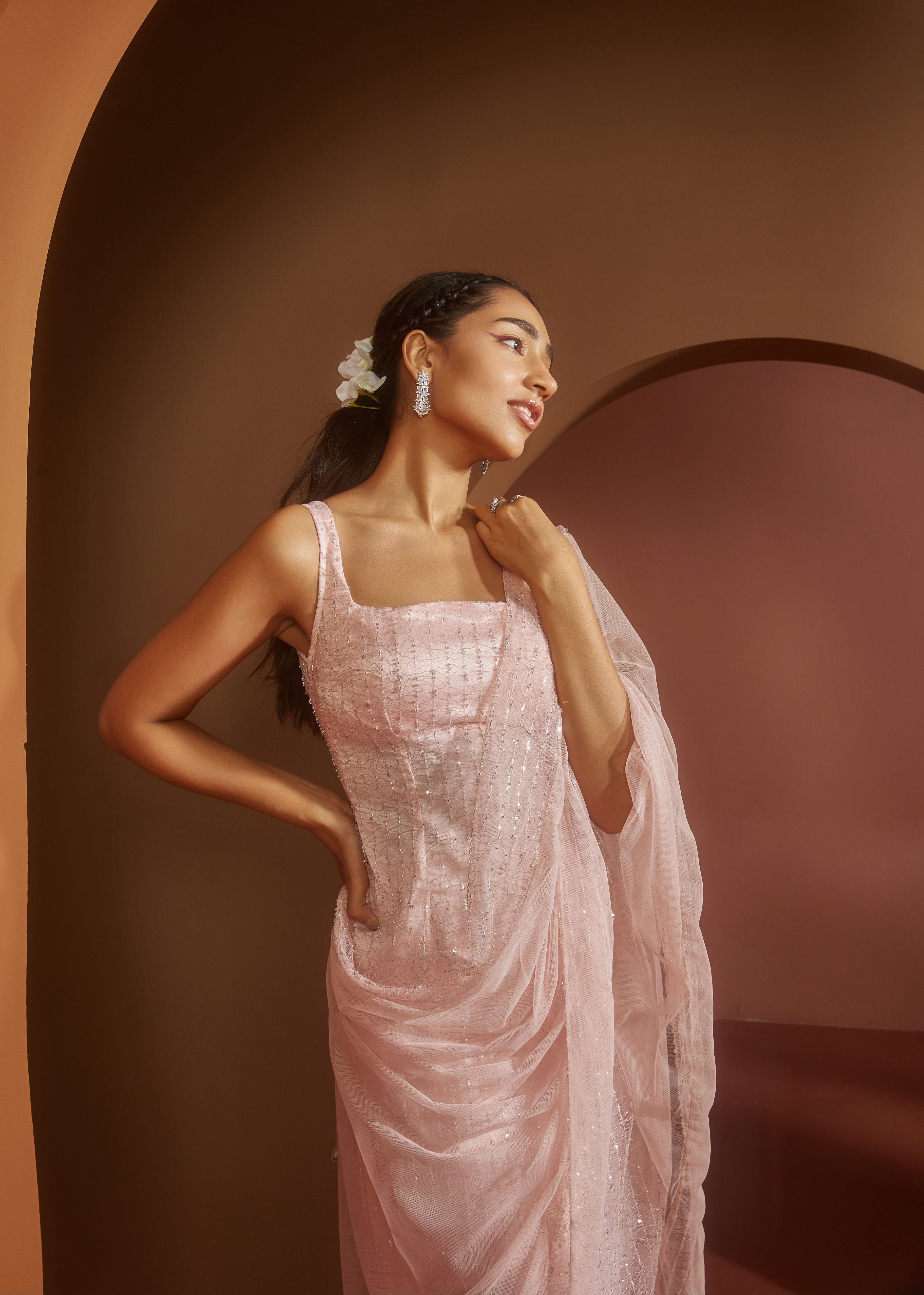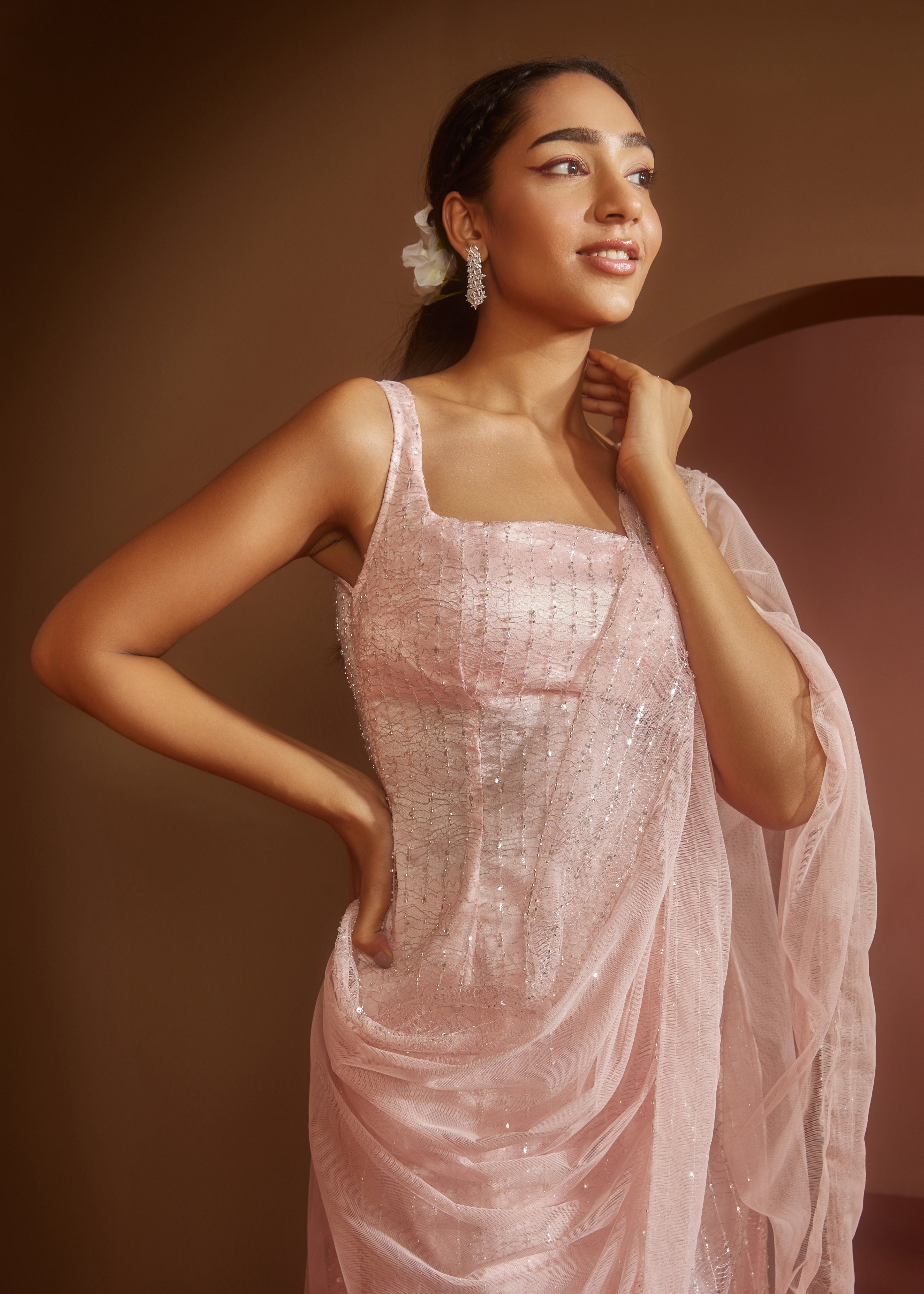 Sarika Pink Flower Embroidery Pre- Draped Saree Set