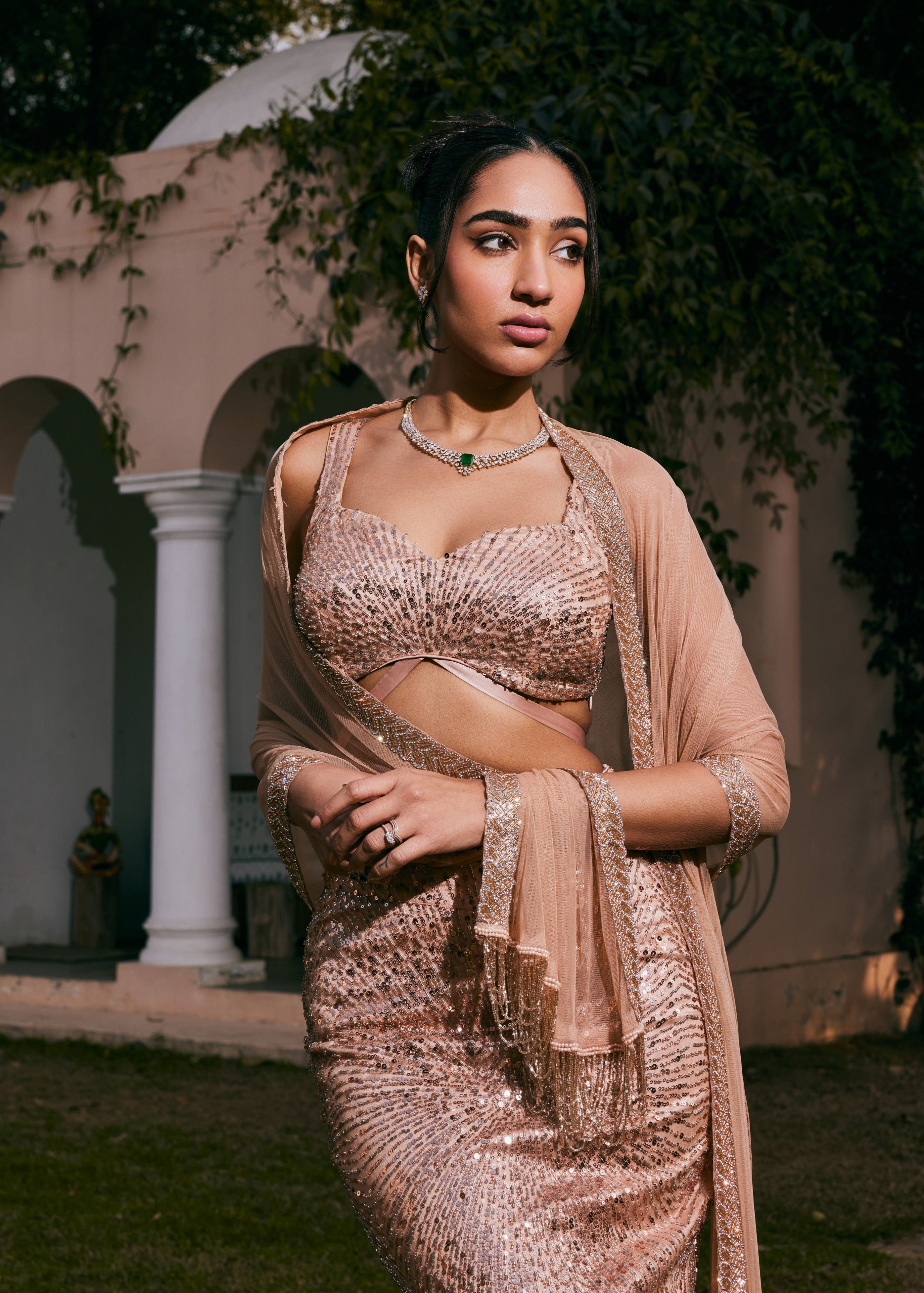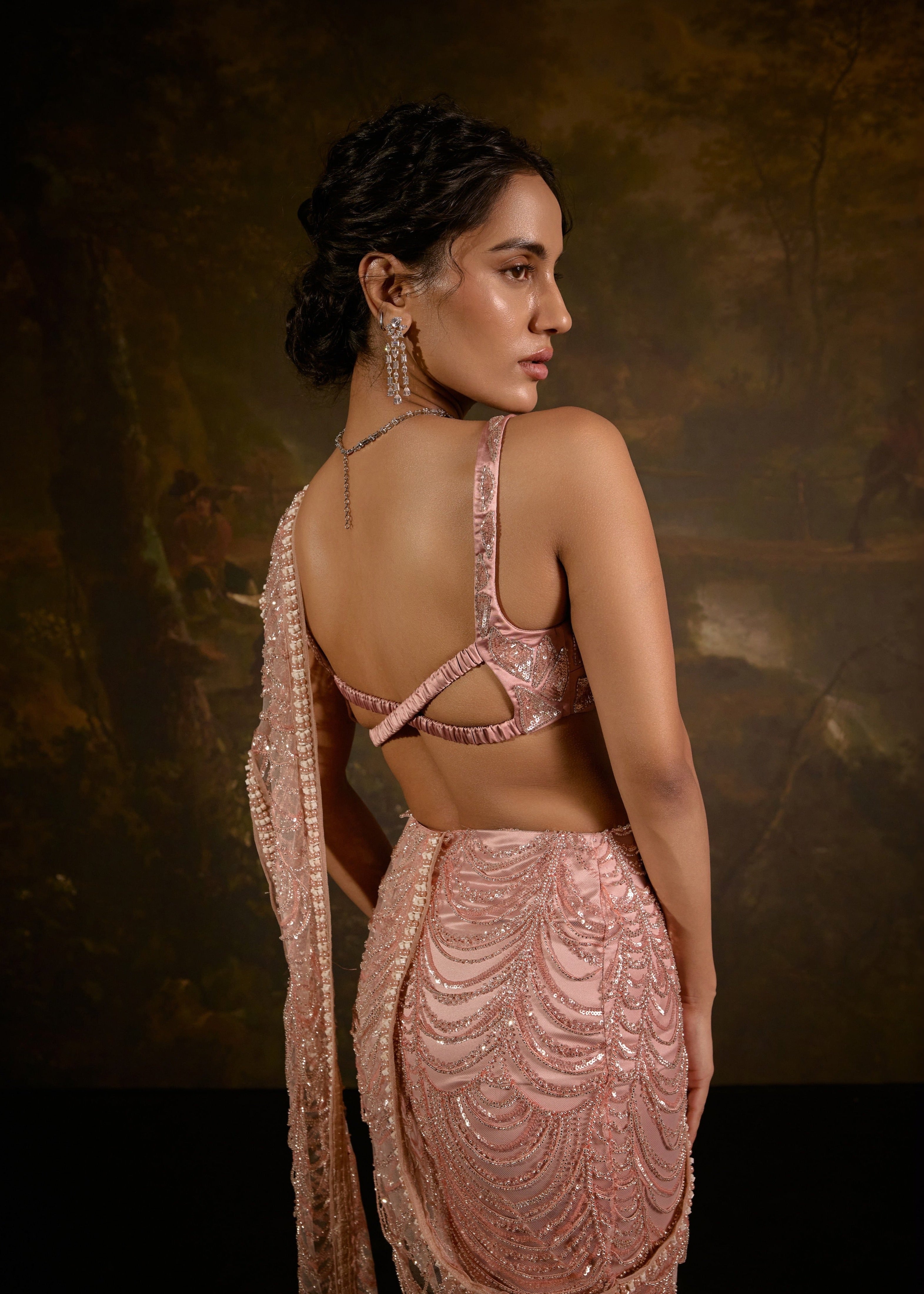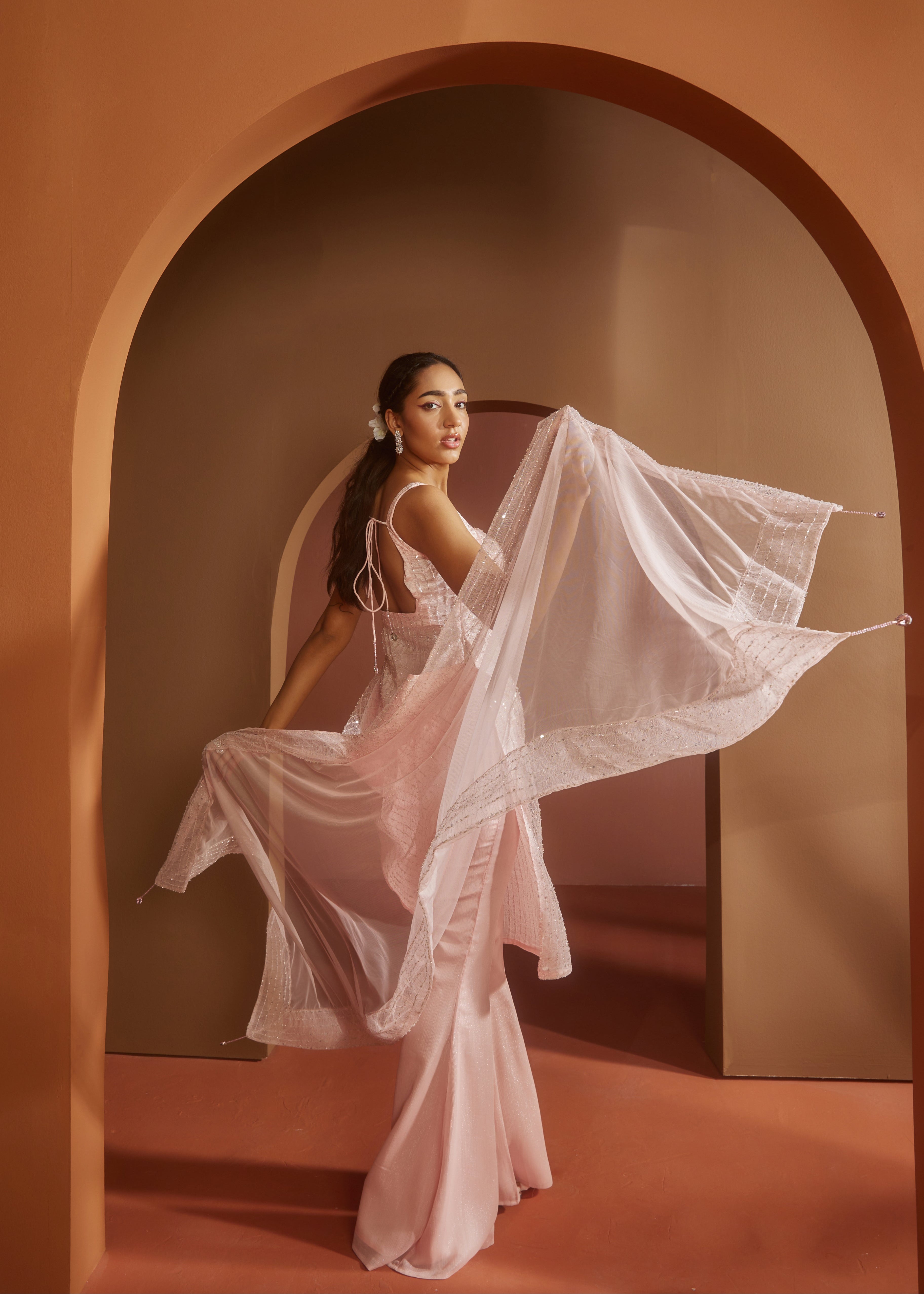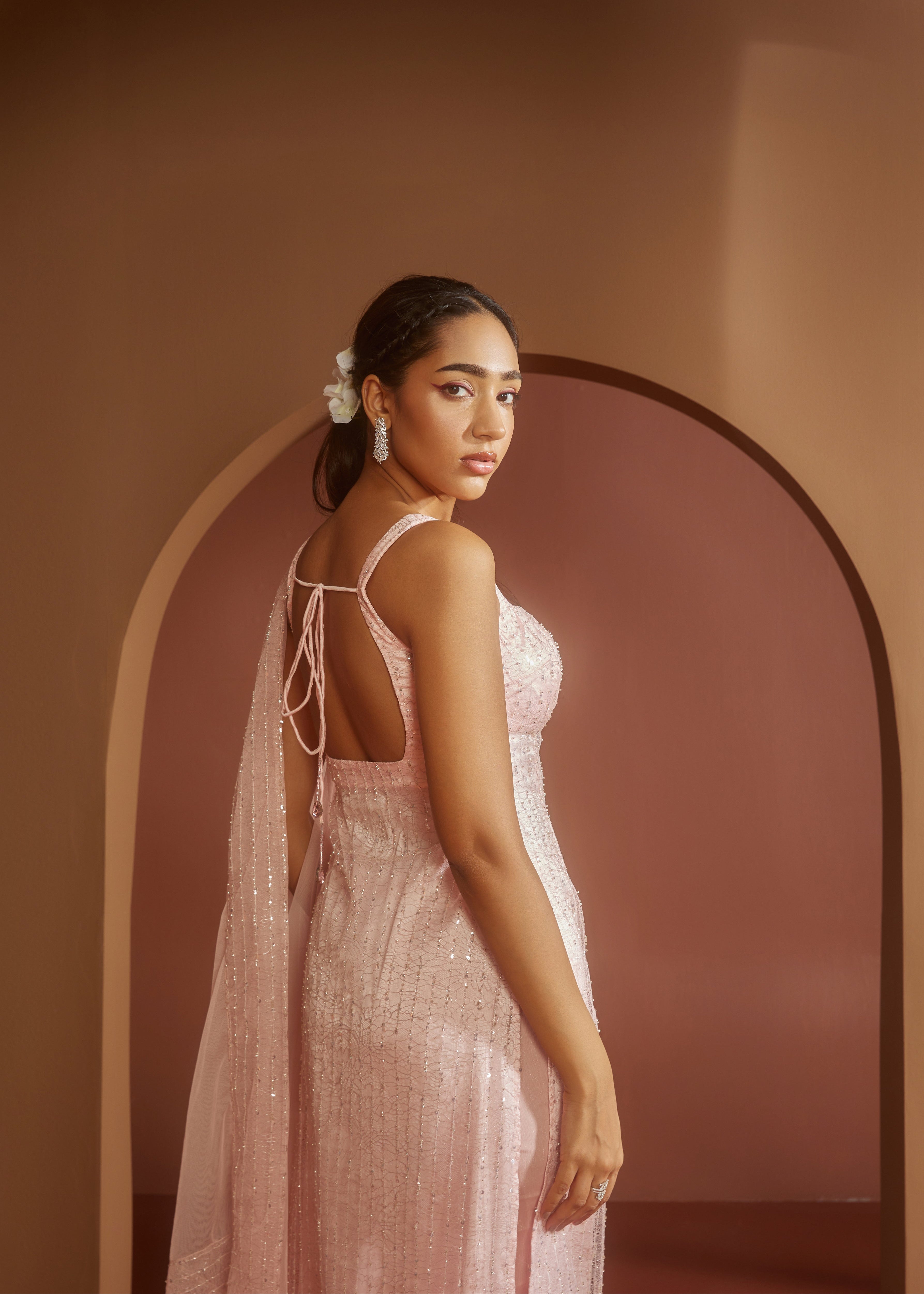 Sarika Pink Flower Embroidery Pre- Draped Saree Set
