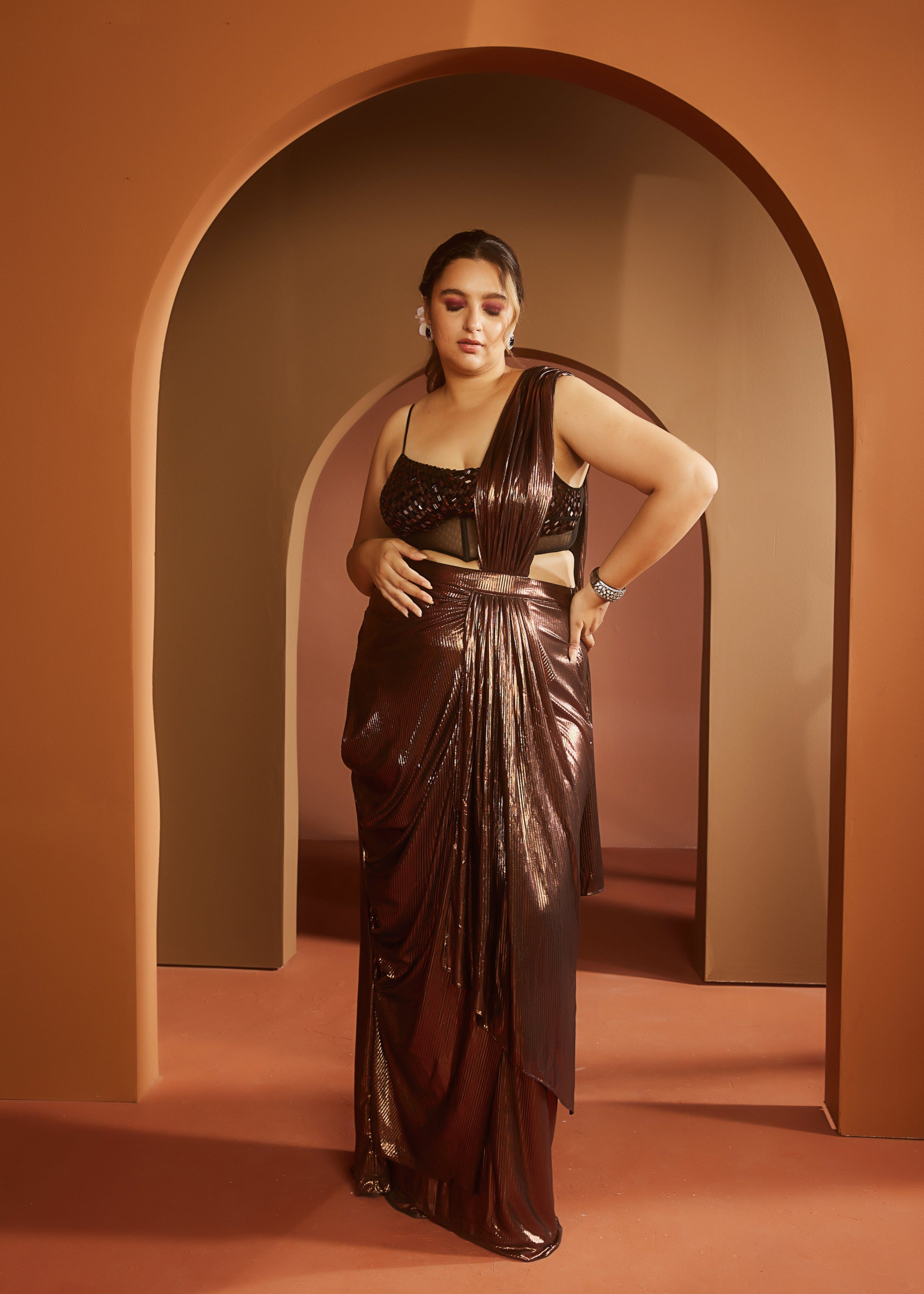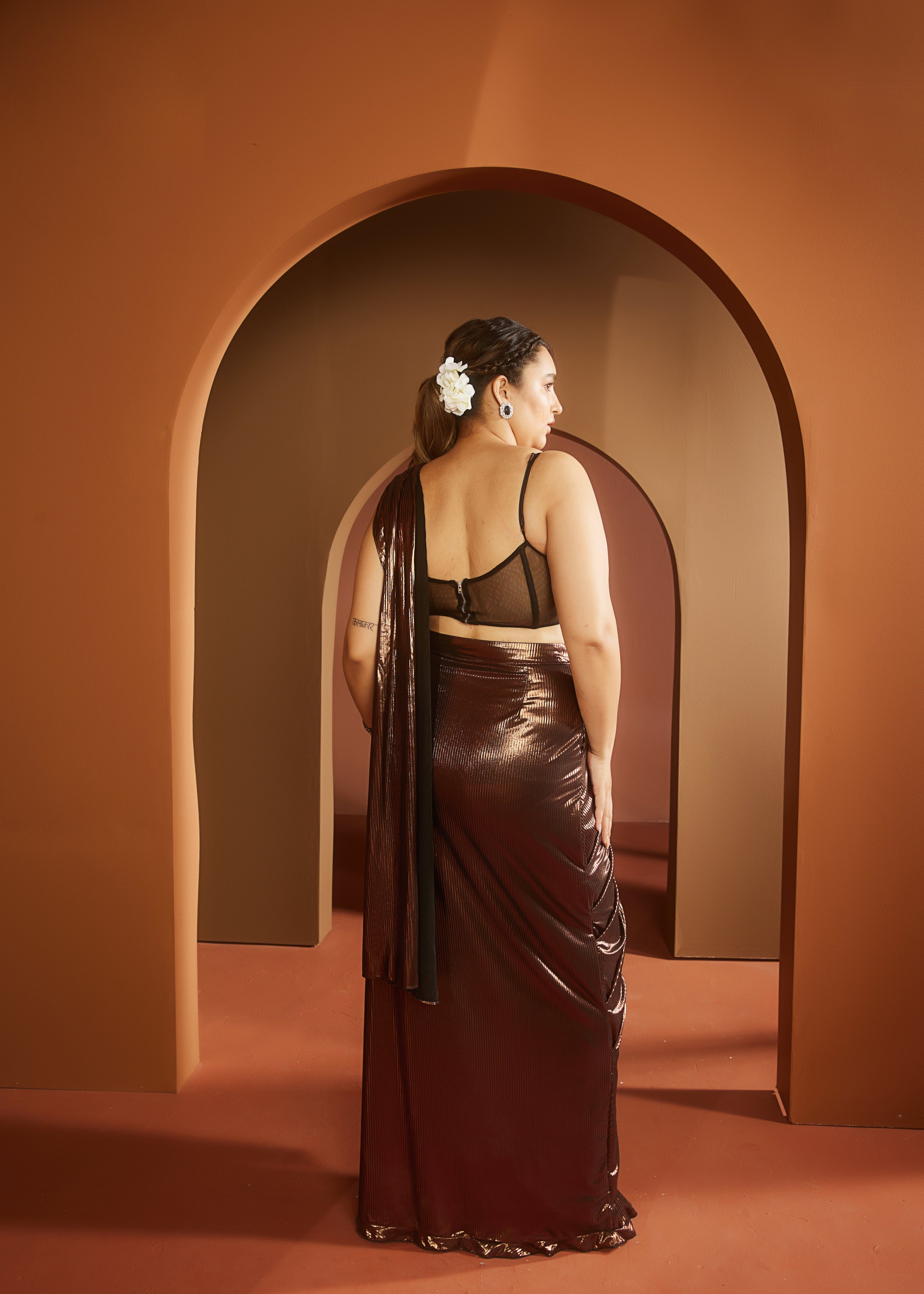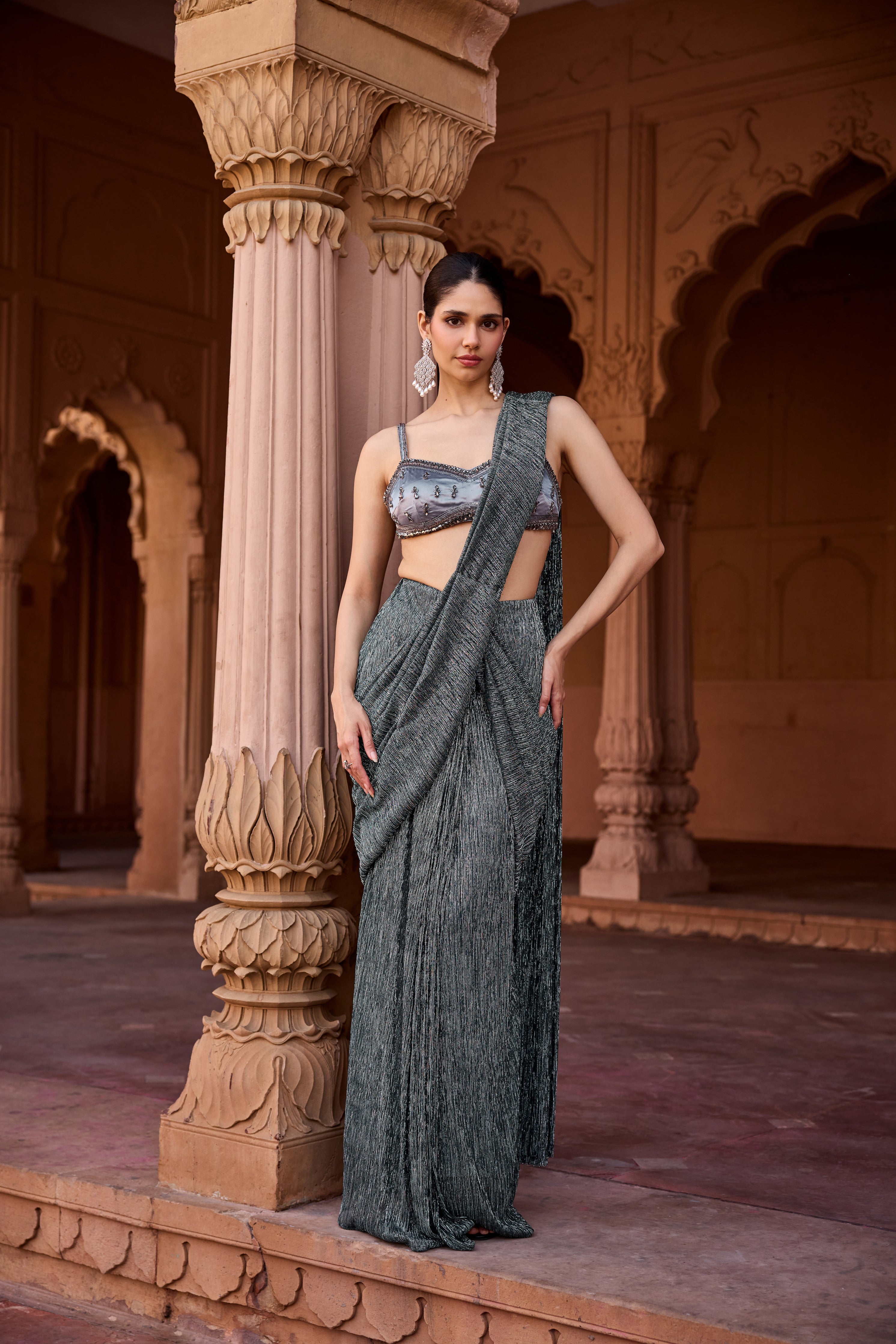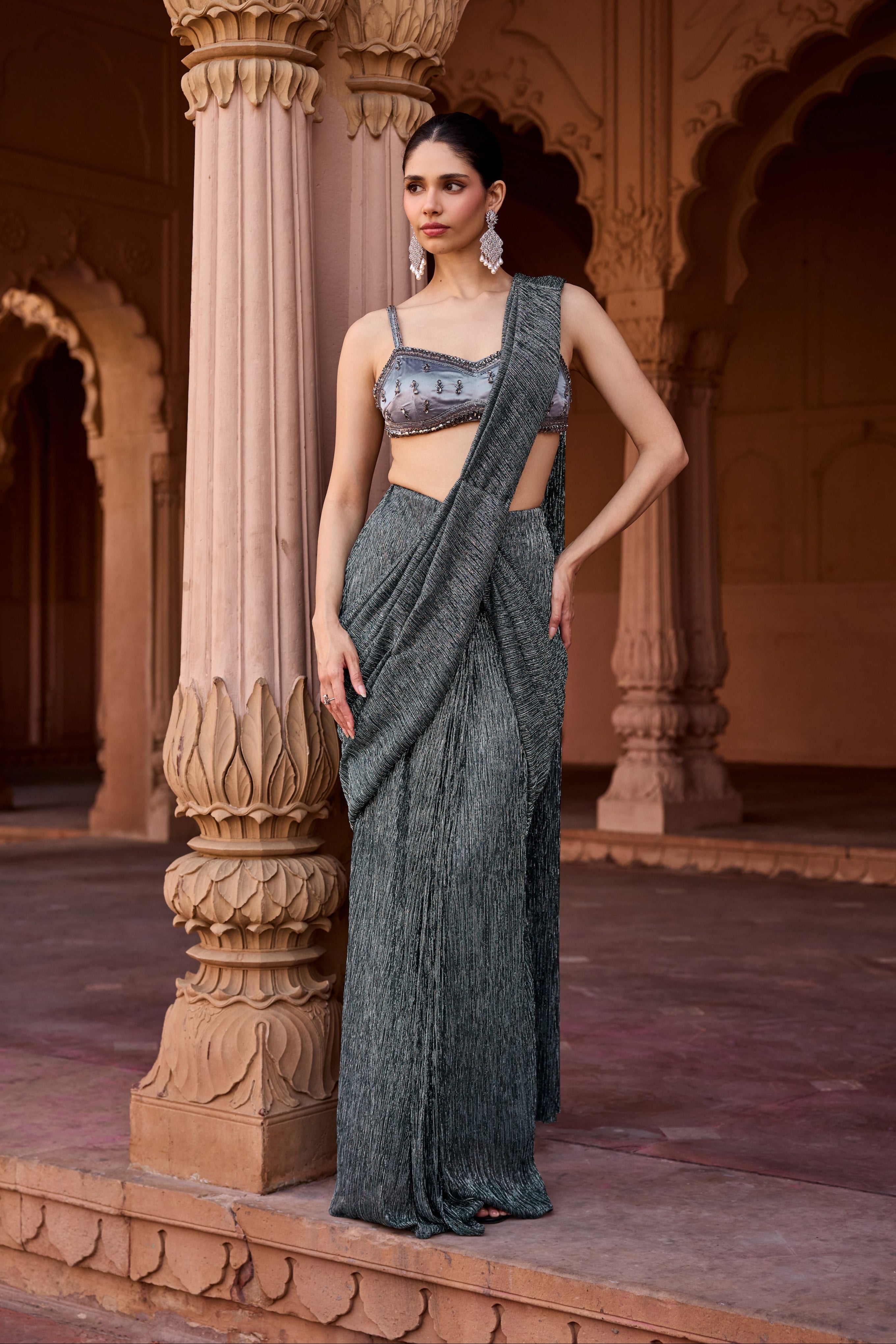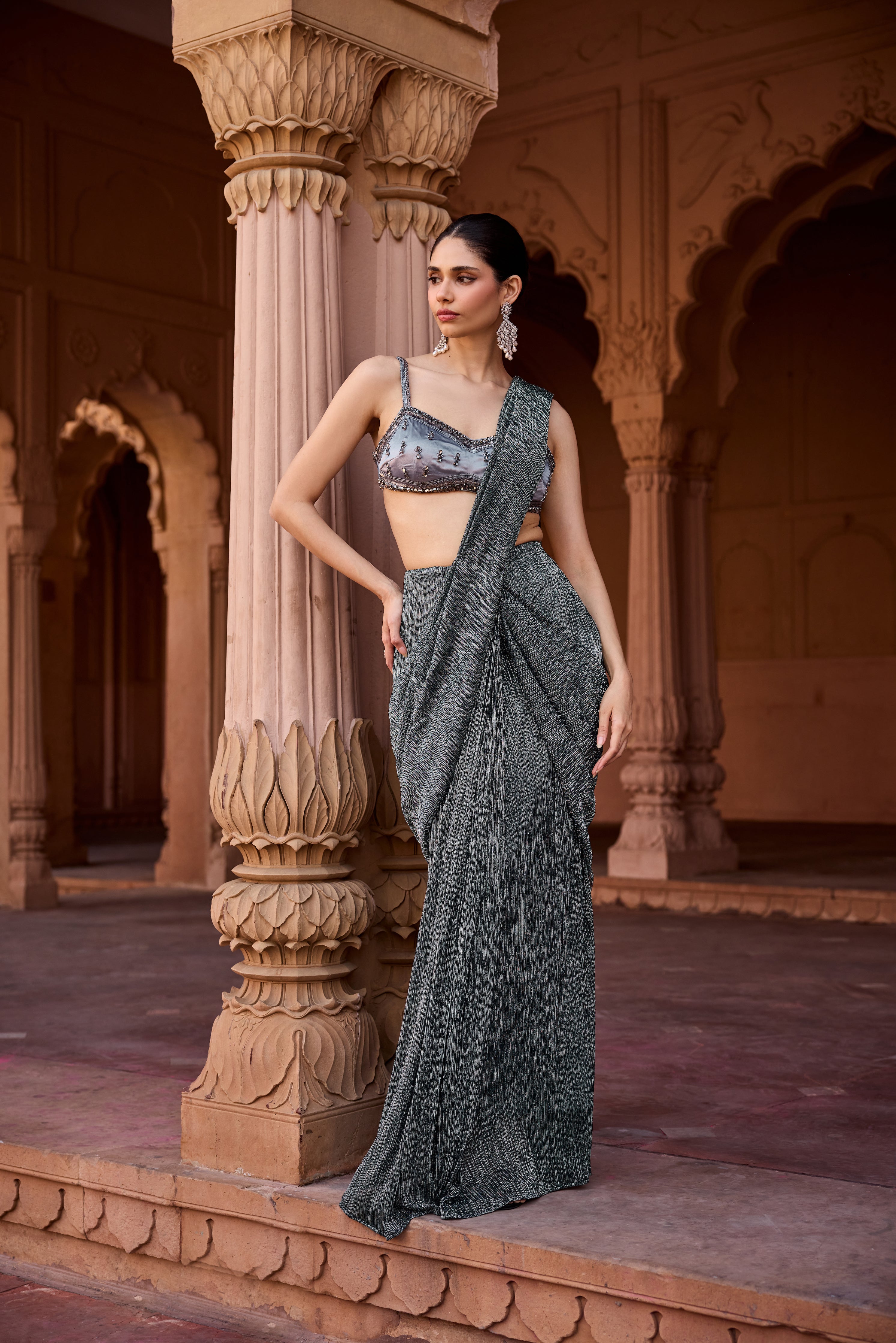 Sobia Grey Shimmer Chiffon Pre- Draped Saree Set