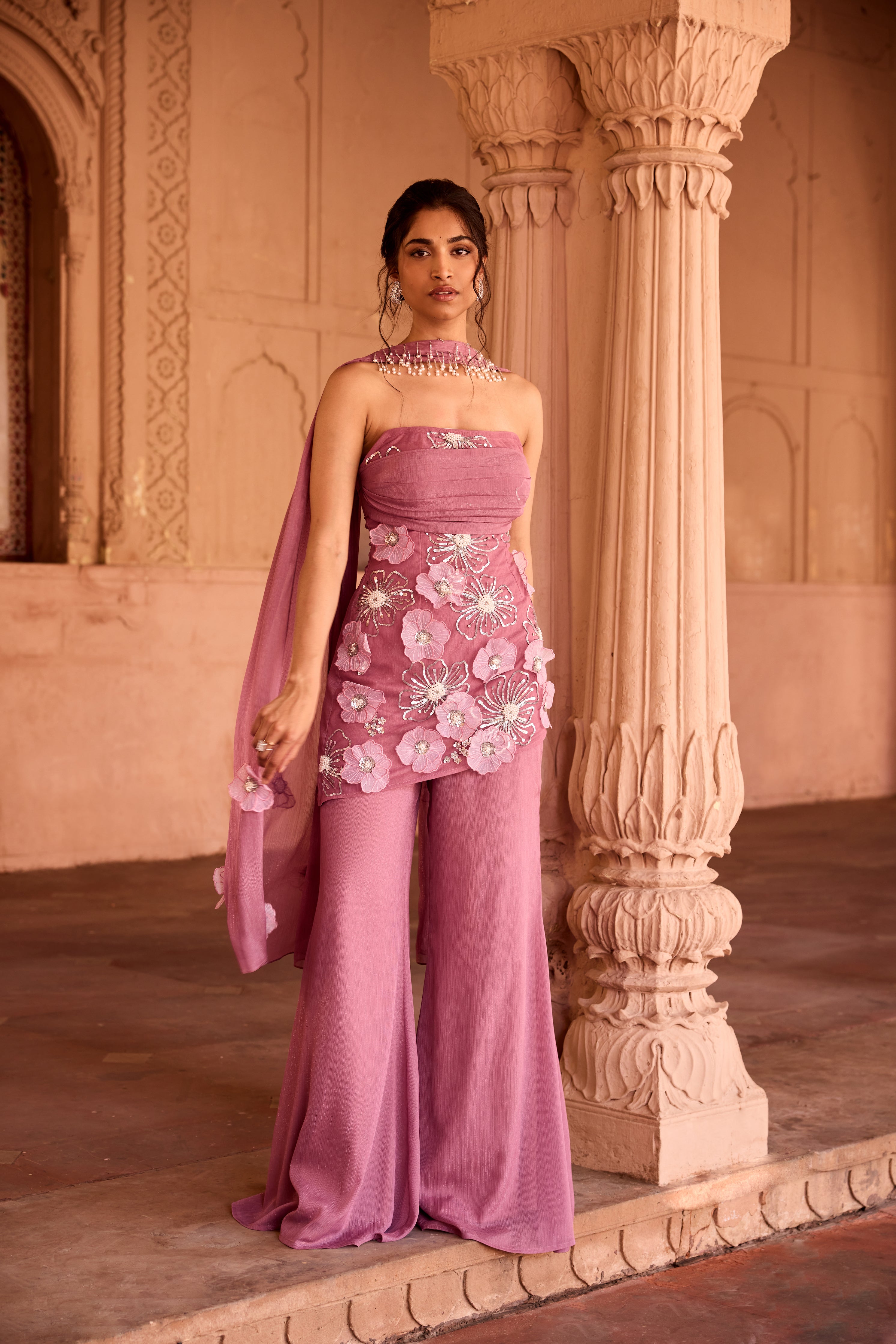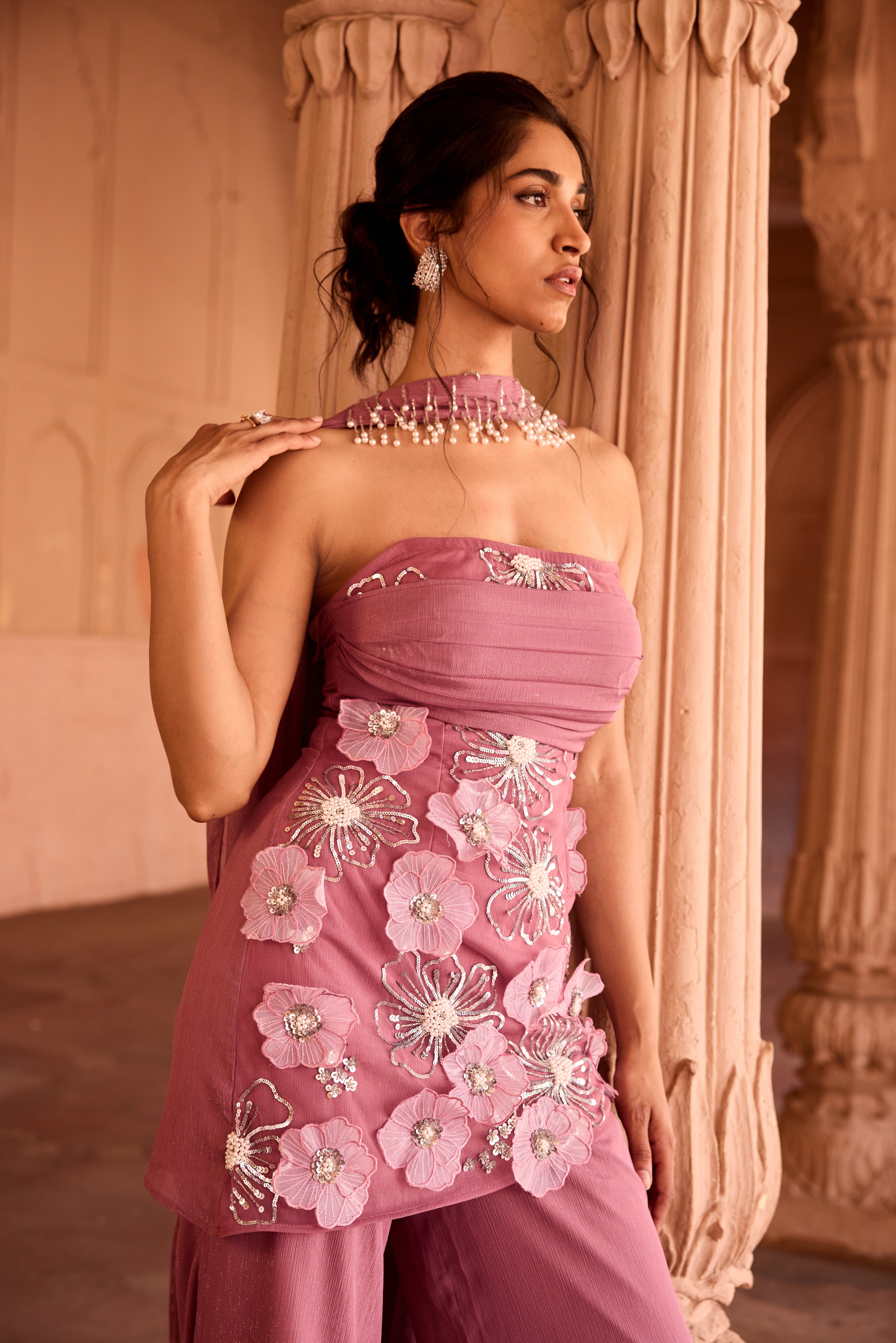 Nakhat Pink 3D Flower Embroidered Sleeveless Sharara Set