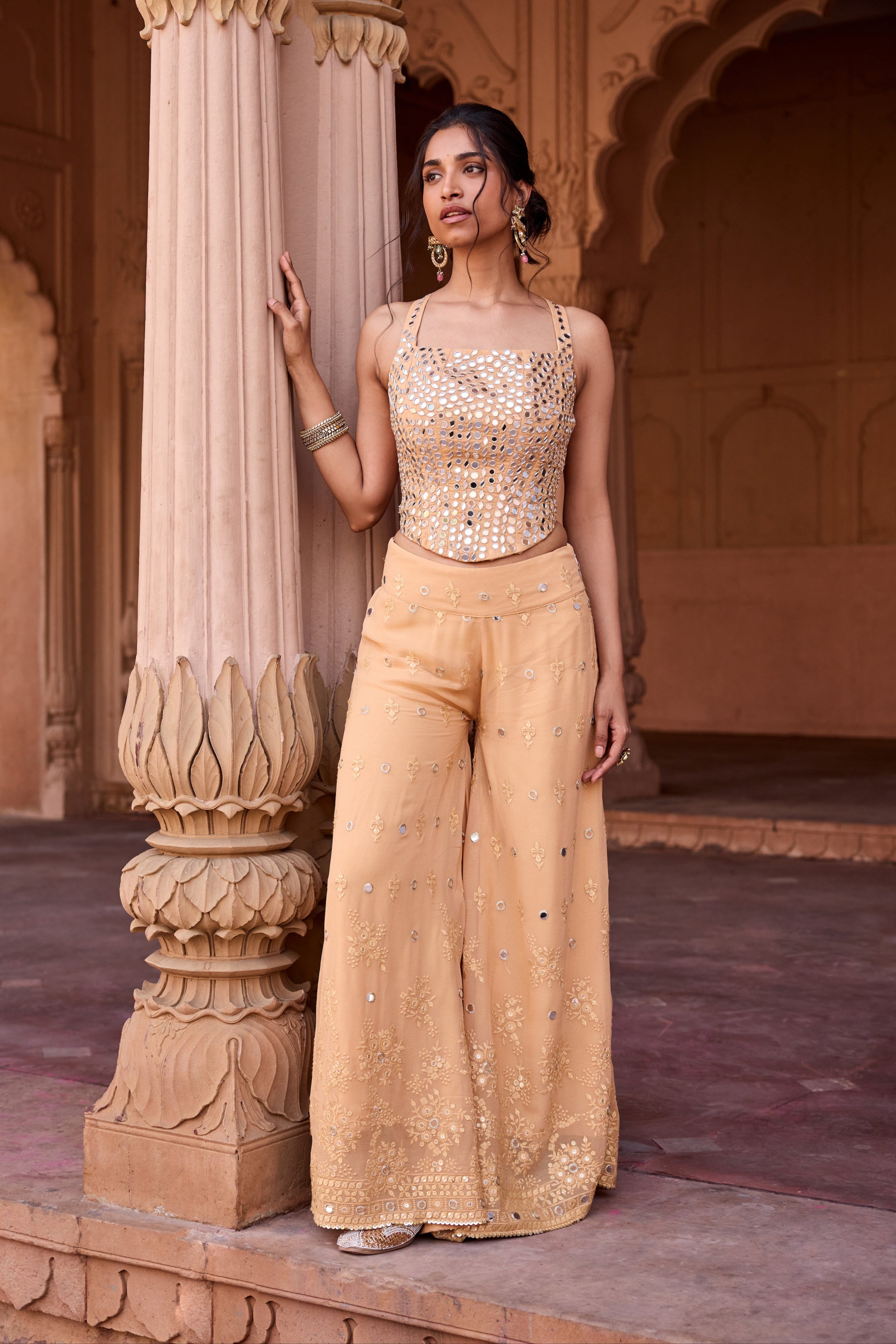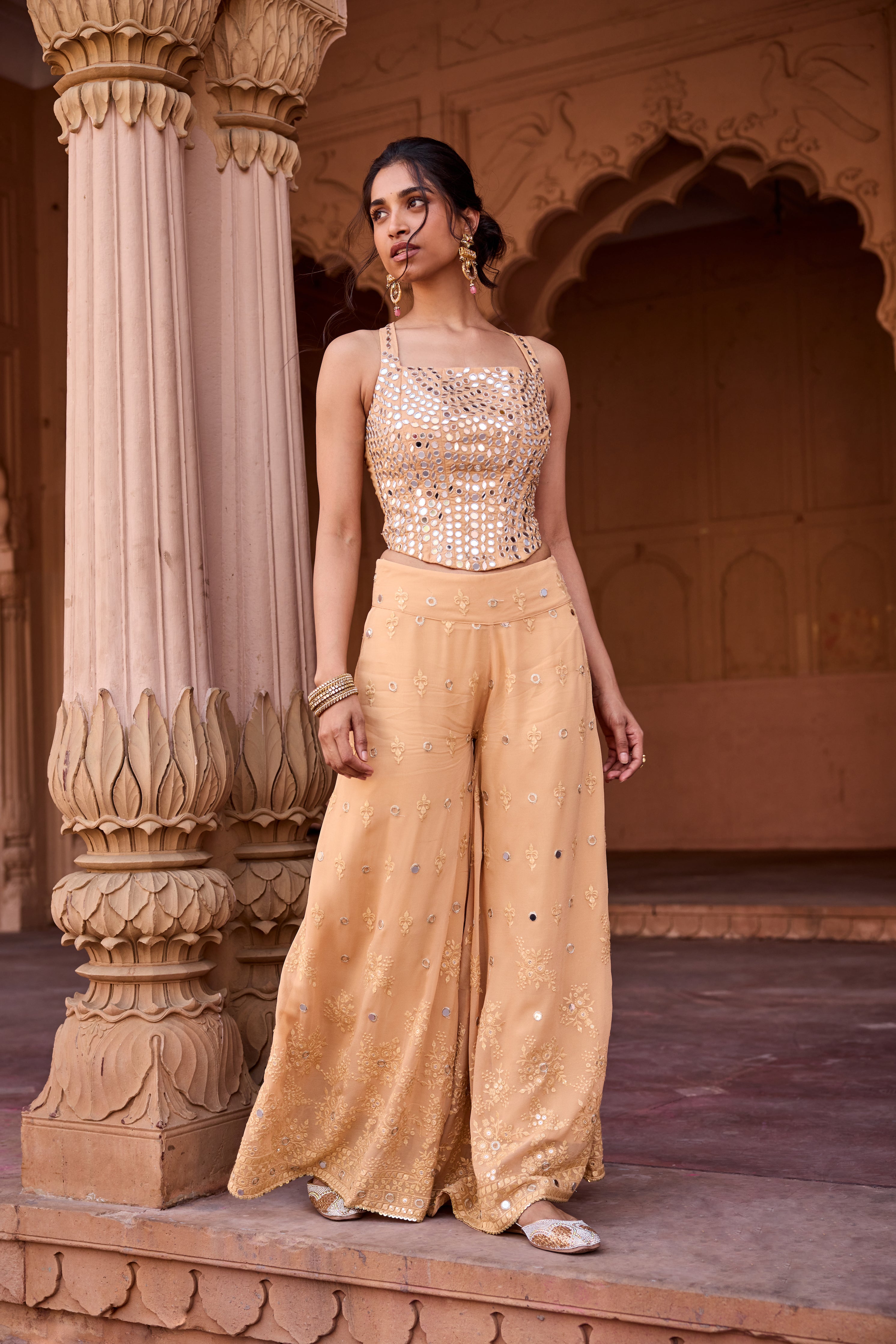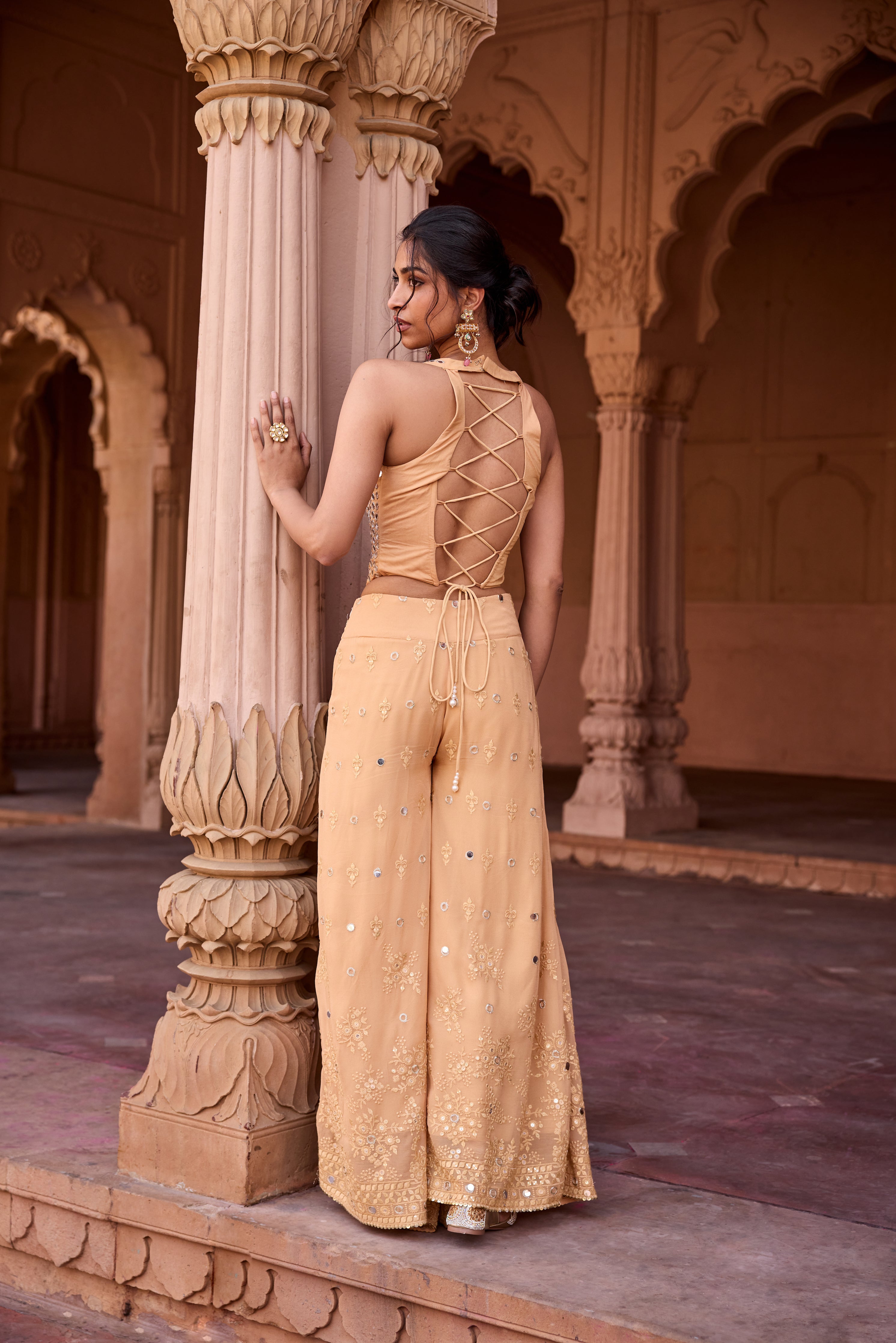 Rumaisa Golden Sleeveless Embroidered Sharara Set