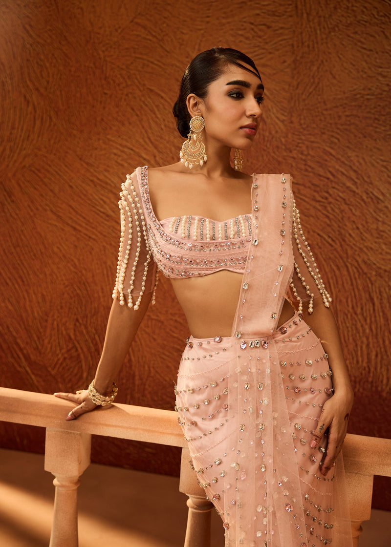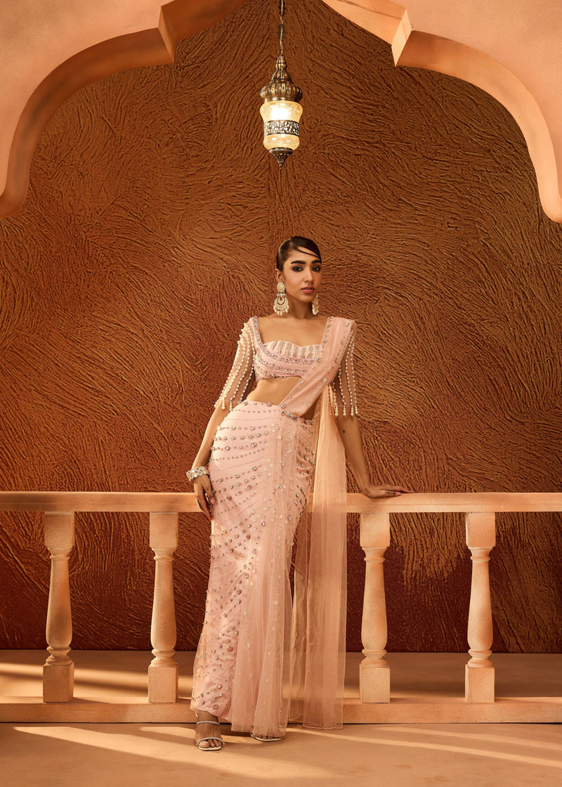 Vedika Baby Pink Rhinestone Embellished Saree