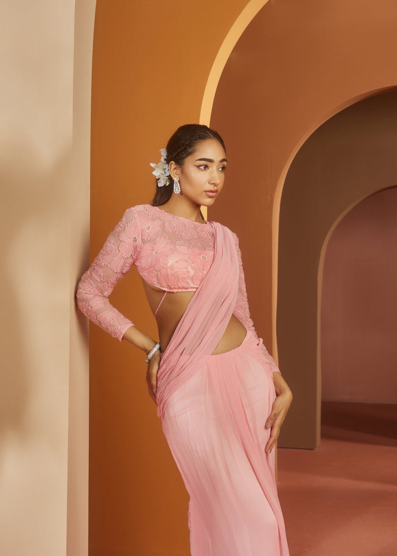 Sarika Pink Flower Embroidery Pre- Draped Saree Set