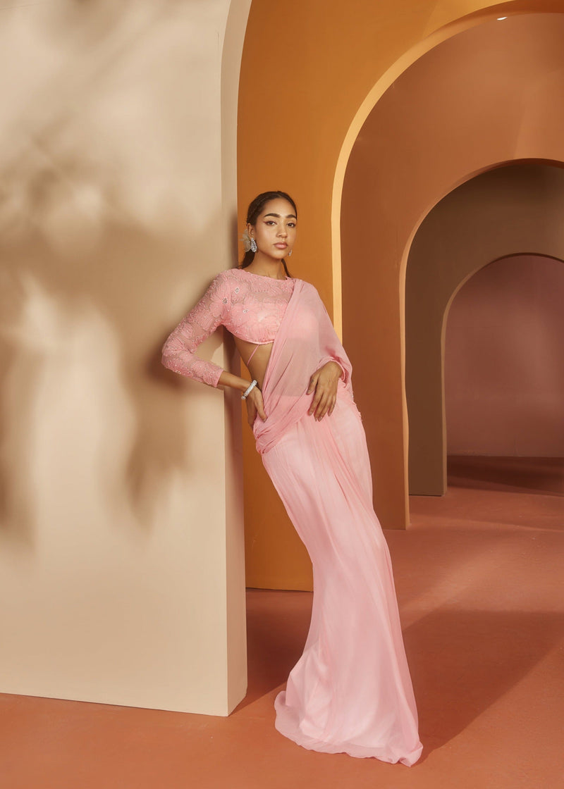 This is what is born when you fuse vintage with vogue. Meet our Sarika Pink Flower Embroidery Pre-Draped Saree. Draped elegance, our Sarika is a pre-stitched chiffon piece in a charming shade of soft pink. It comes with a jaw-dropping blouse featuring all-over floral hand embroidery and pearl detailing. The cropped curved front hem and bareback with tie closure up the oomph factor. The pallu contains a hint of matching pearls and floral hand embroidery, and the saree is pre-draped, making it effortless to carry and fun to be in.