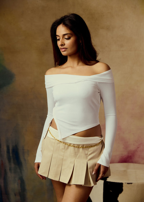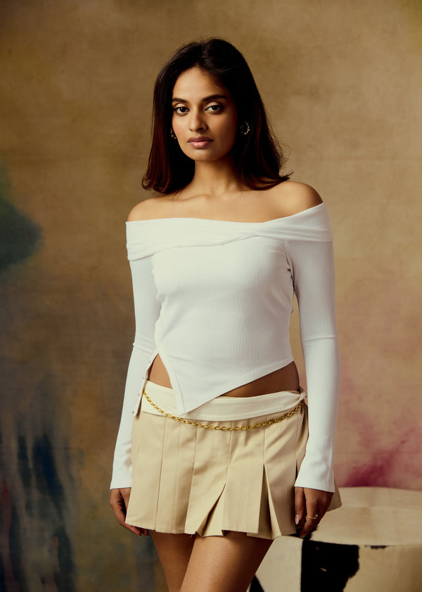 Beryl White Ribbed Off-Shoulder Top