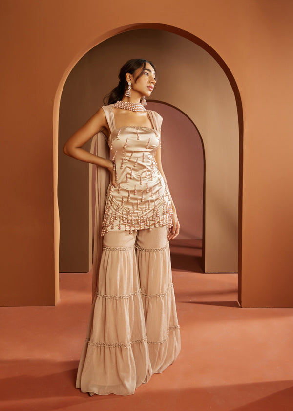 Aneesa Peach Mirror-Embroidered Sharara Set