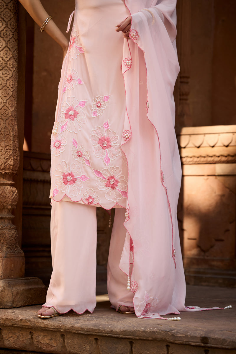 Sunshine, summer weddings, and swoon-worthy outfits—meet your new summer staple: the Raaya Baby Pink Embroidered Sleeveless Kurta Set! Crafted from the softest luxe poly georgette and poly crepe fabric, our Raaya features a sleeveless kurta with an intricately embroidered neckline and crisscross back detailing adds a flirty touch, making sure you look fabulous from every angle. the high side slits with charming tie-up details give this suit a contemporary edge. Plus, the floral embroidery towards the bottom and the scalloped hemline? Simply irresistible! The accompanying high-waist sharara set is designed with a side zip closure for a snug fit. The scalloped detailing ensures that every movement you make is pure poetry. The sheer baby blue dupatta, adorned with delicate pearl embroidery along the sides, adds just the right amount of sparkle to your summer glow.