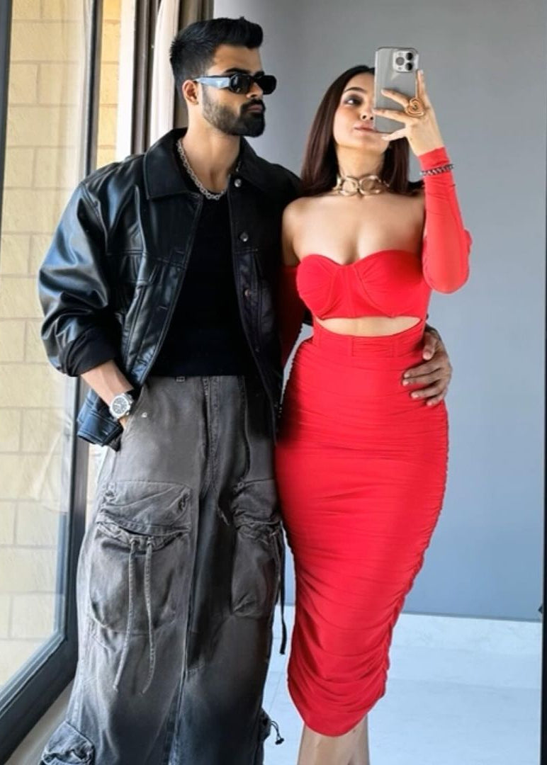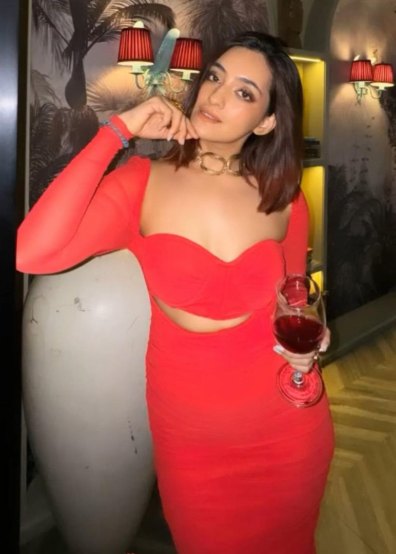 Tatiana Red Ruched Mesh Midi Corset Dress CL