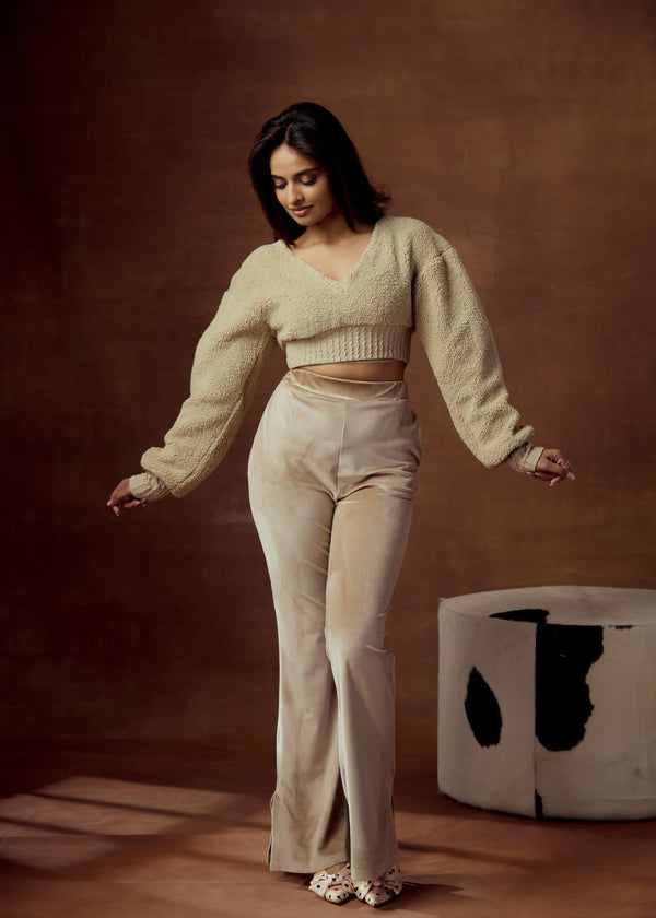 Autumn Turtle Neck Cutout Crop Top and Textured Velvet Pants Set