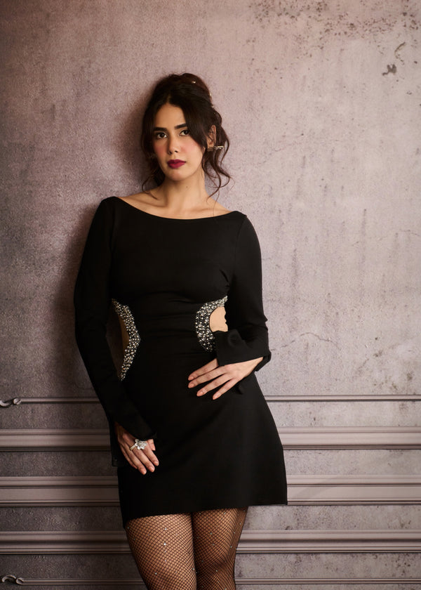 Amara Black Rhinestone Embellished A-Line Mini Dress