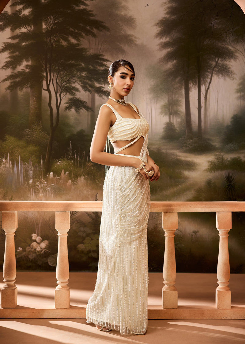 - Pre-draped Pearl Embroidered Saree in a High-waist Mermaid Silhouette.