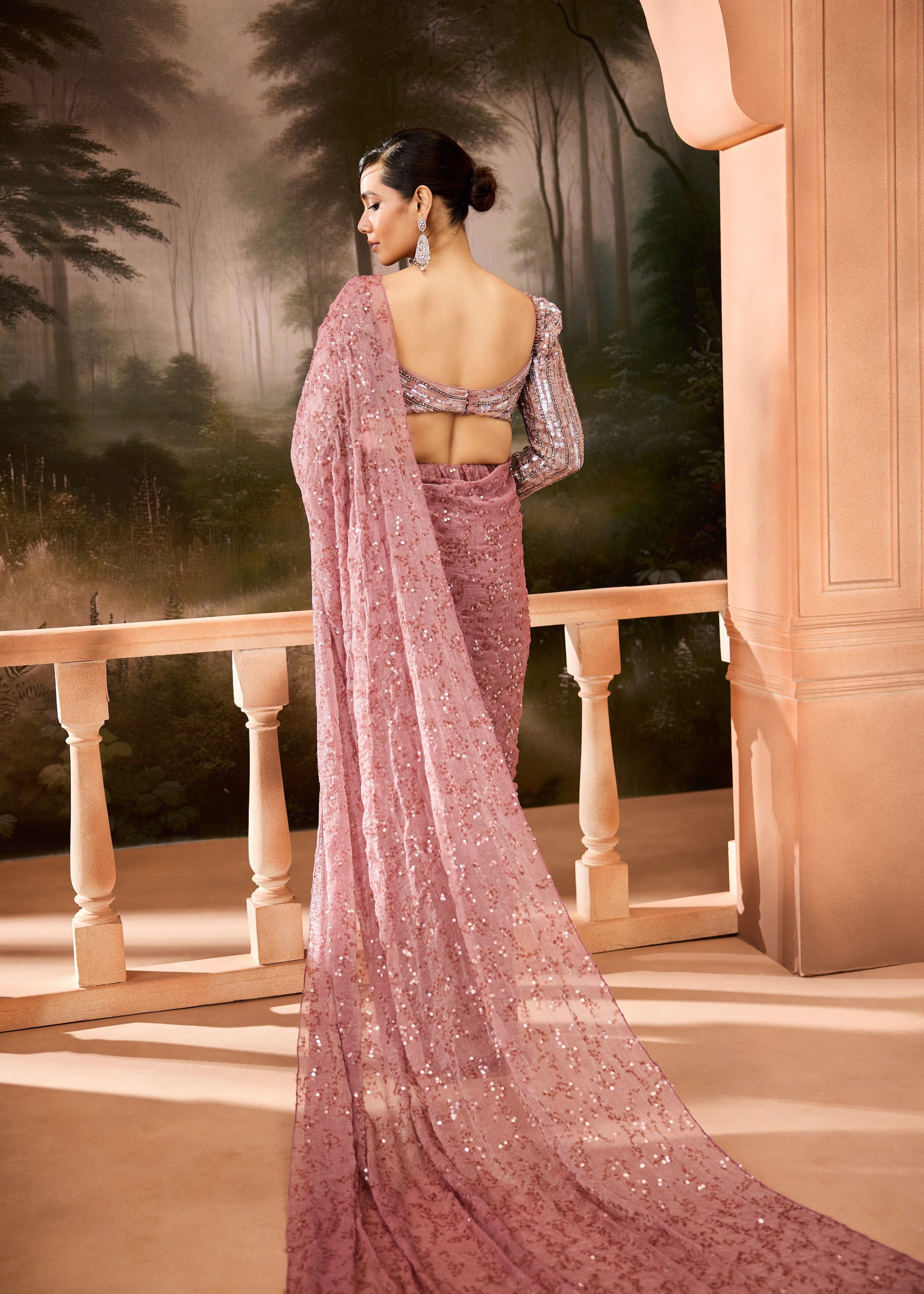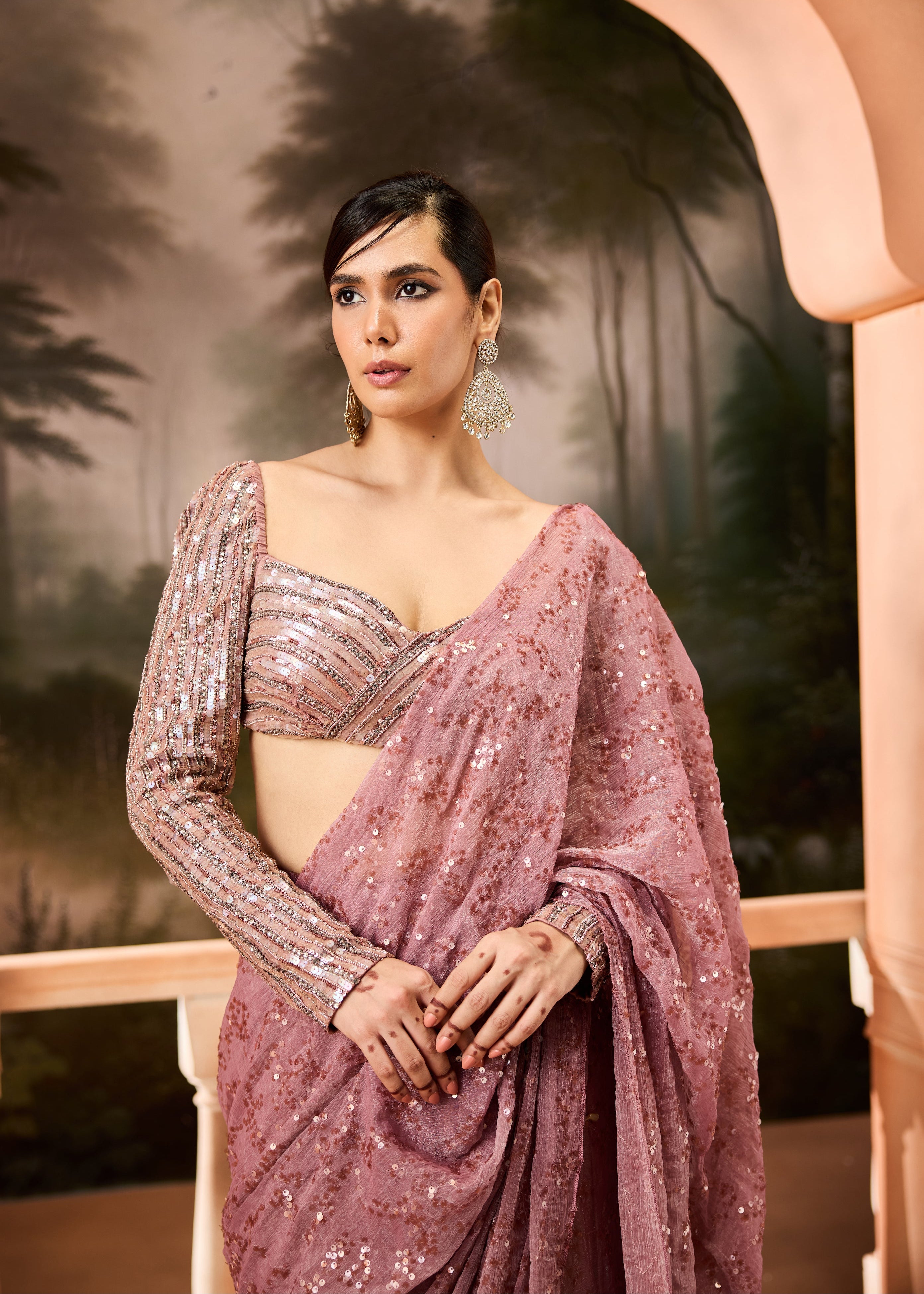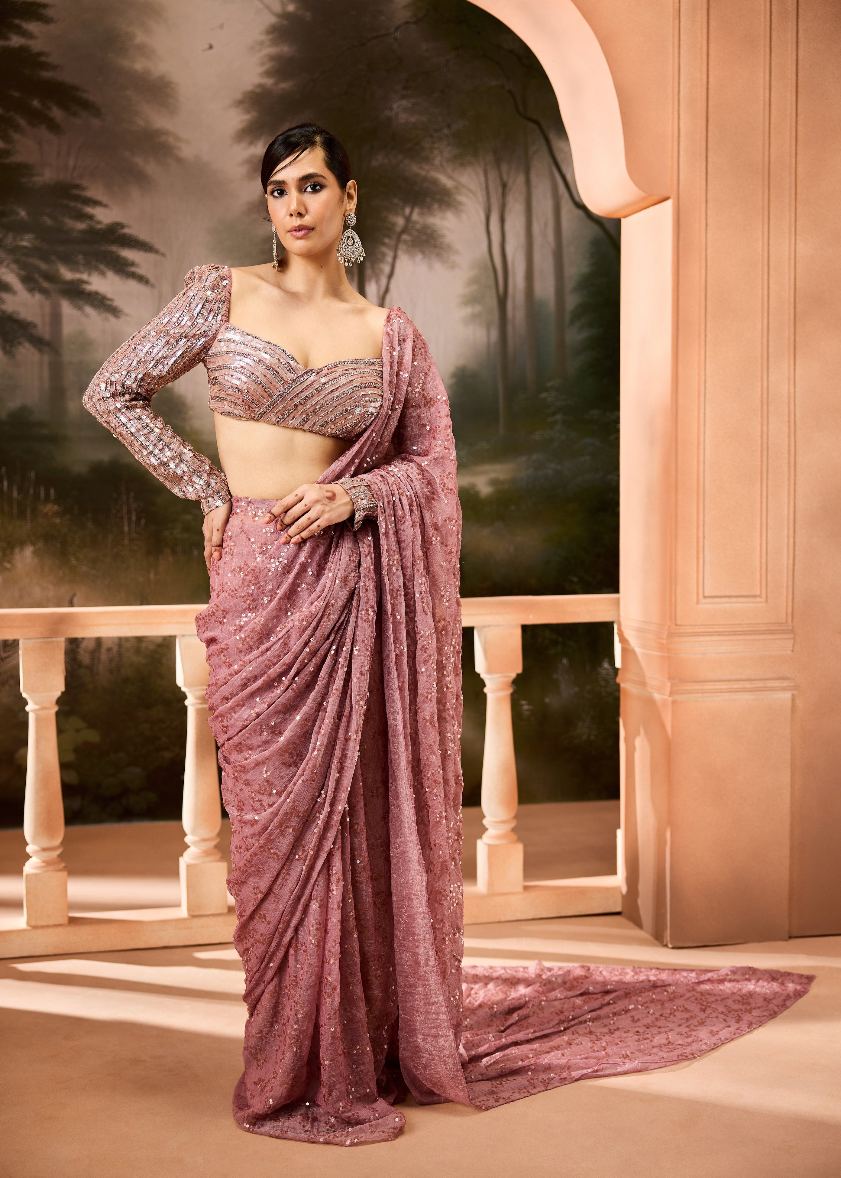 Sarika Pink Flower Embroidery Pre- Draped Saree Set