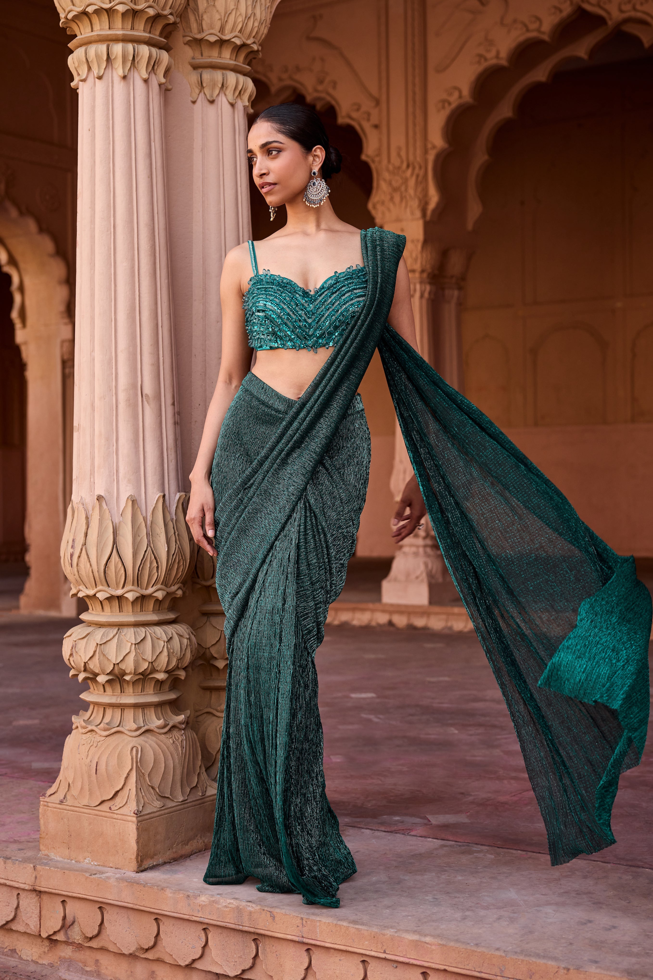 Iranya Hand Embroidered Mirror Blouse and Floral Tissue Pre-Drape Saree Set
