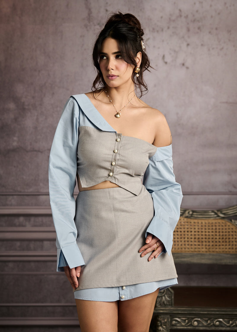 Fia Baby Blue and Grey Mini Skirt: Where Comfort Meets Cool. The combination of rich soft grey suiting fabric and baby blue poplin is simply stunning. The mini skirt with a high-waist silhouette is flattering. The double tiered hemline closure adds a touch of sophistication.