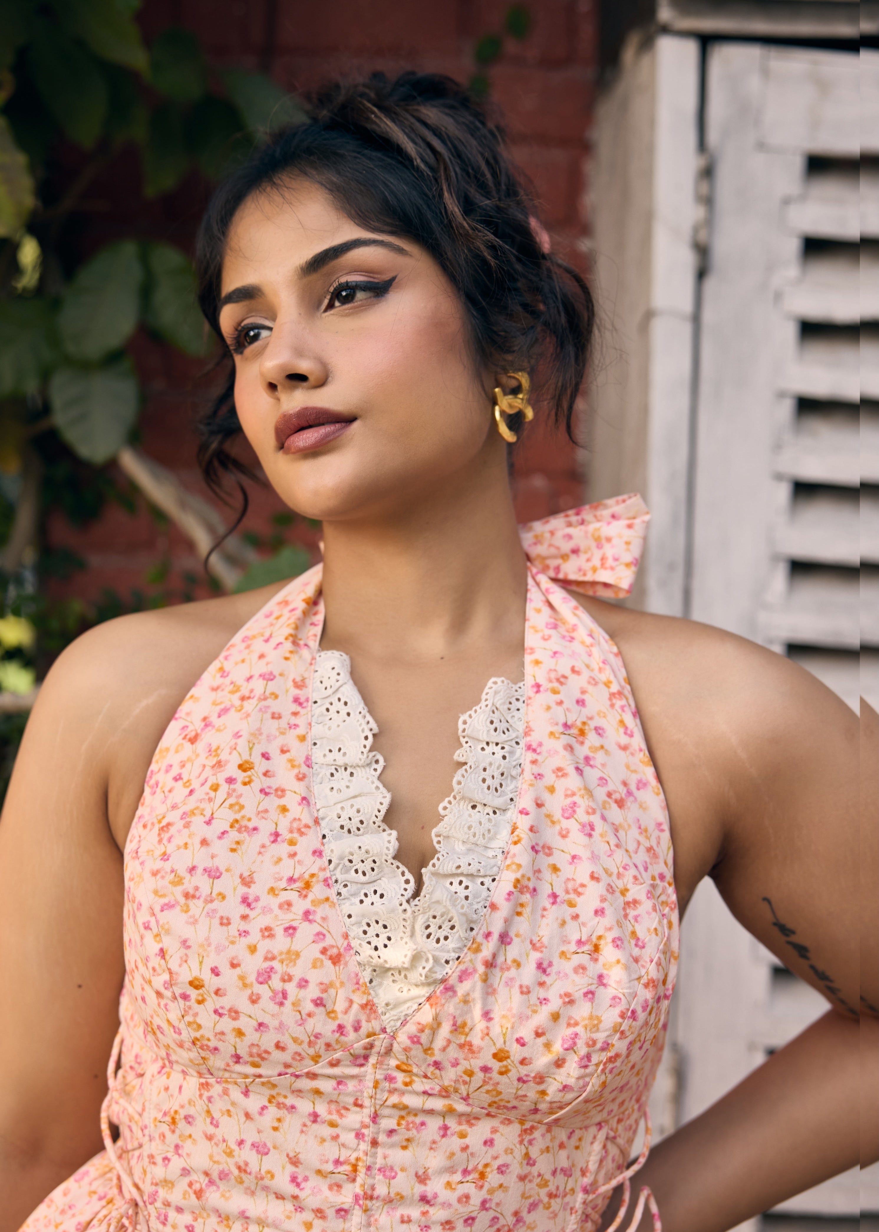 Nicole Baby Pink Mesh Lace-Up Corset Midi Dress CL
