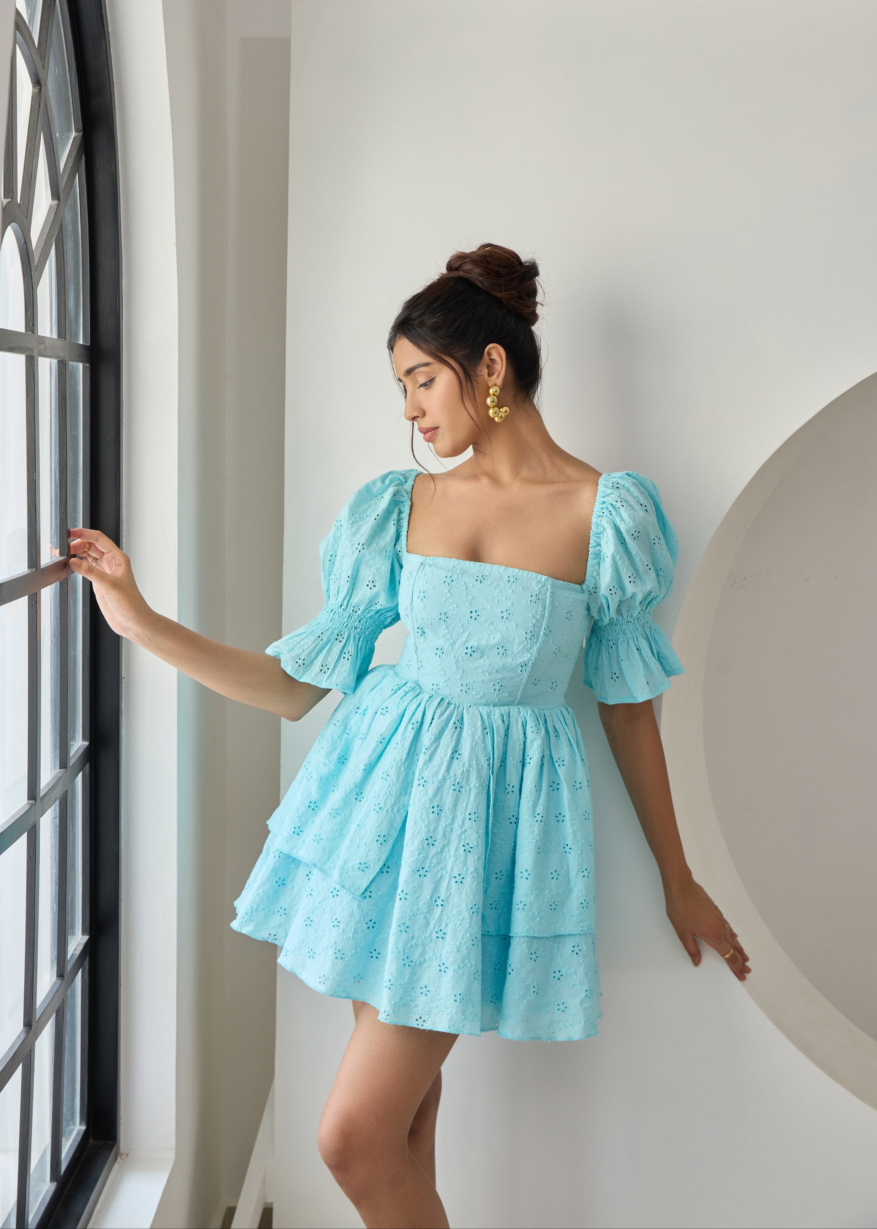 Pixie Powder Blue Schiffli Puff Corset Dress