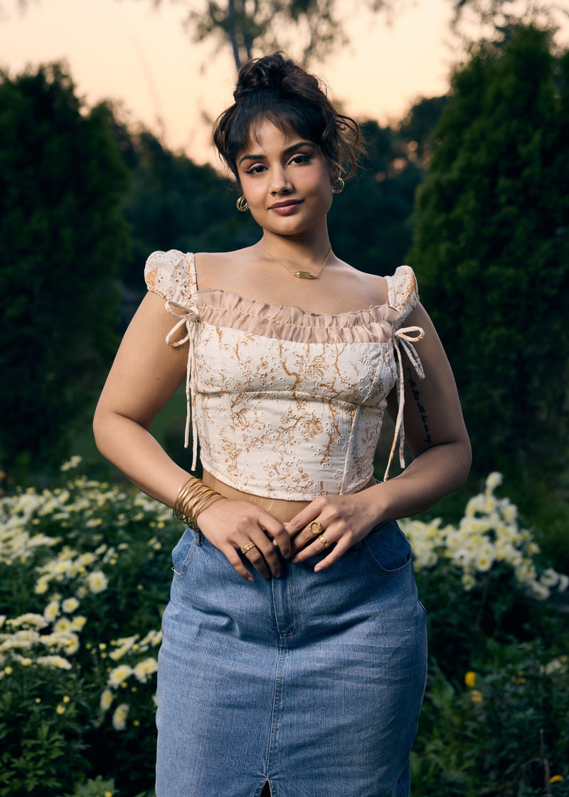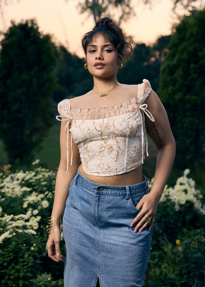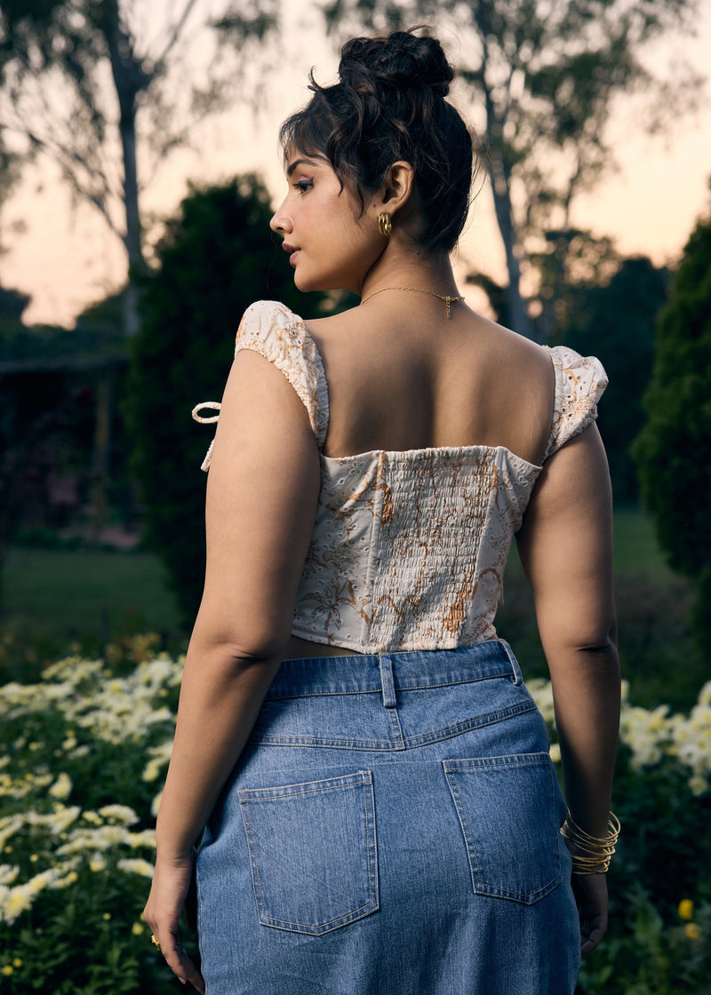 If Jane Austen wrote fashion fairytales, the Shania Peach White Corset Top would be her muse! Drenched in dreamy peach and white florals, this puff-sleeve beauty is crafted from rich schiffli fabric that whispers vintage romance. The straight neckline, adorned with delicate ruffled organza, frames your décolletage like a masterpiece, while dainty bow accents add just the right touch of coquette charm. And, of course, we’ve infused our signature boned corsetry to cinch, sculpt, and serve major main character energy.