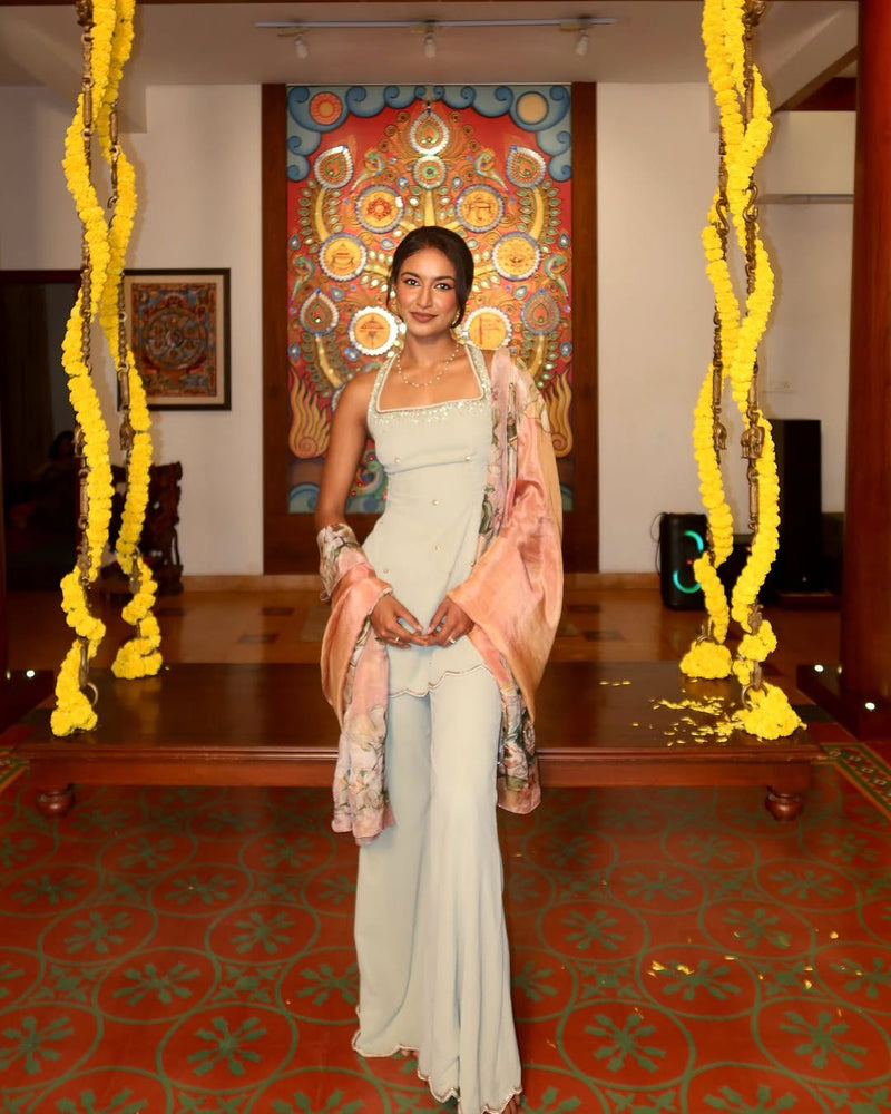 Now, let’s talk about those wide-leg sharara pants—flowy, fun, and finished with scalloped edges that scream regal drama. And to top it all off? A printed dupatta with mirror embellishments that effortlessly ties the whole look together.