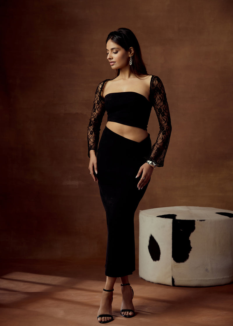 Meet your new power move in the form of a skirt! The Nelle Black Maxi Skirt is all about making a statement — subtle, yet striking. Crafted from luxurious textured neoprene and finished with the softest black lace, this skirt is equal parts edgy and elegant. The deep off-center V waistline adds a daring twist, while the side slit serves just the right amount of drama. With a sleek side zip closure, it fits like a dream and flows like poetry.
