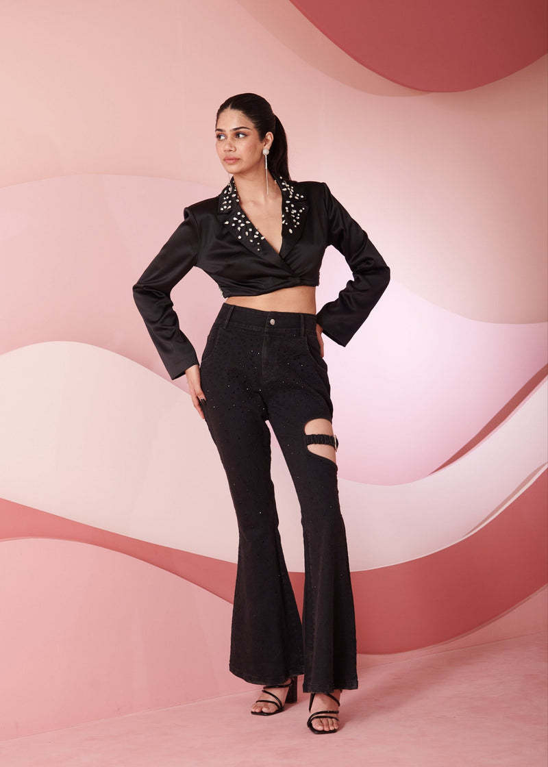 Get ready to make a glam boss-lady statement in our Mila Black Satin Crop Jacket. First, the star of the fit – the glamorous cropped blazer-like top fashioned in rich satin, garnished with hand-embroidered gemstones around the collar and the back in a scattered fashion. Truly giving POWER GLAM. Not only that, it features a racer-back cutout at the back, shooting the style quotient up and how!