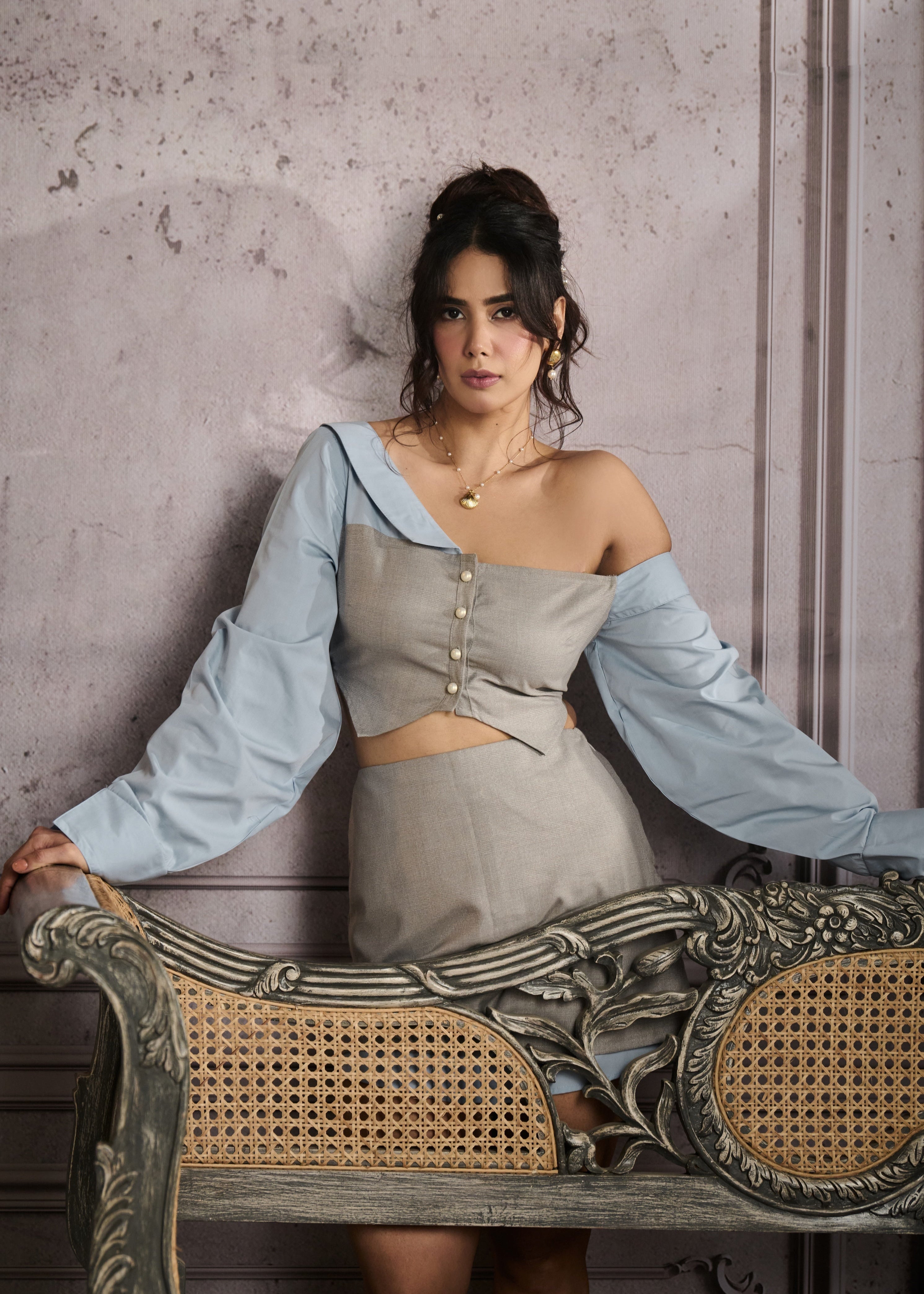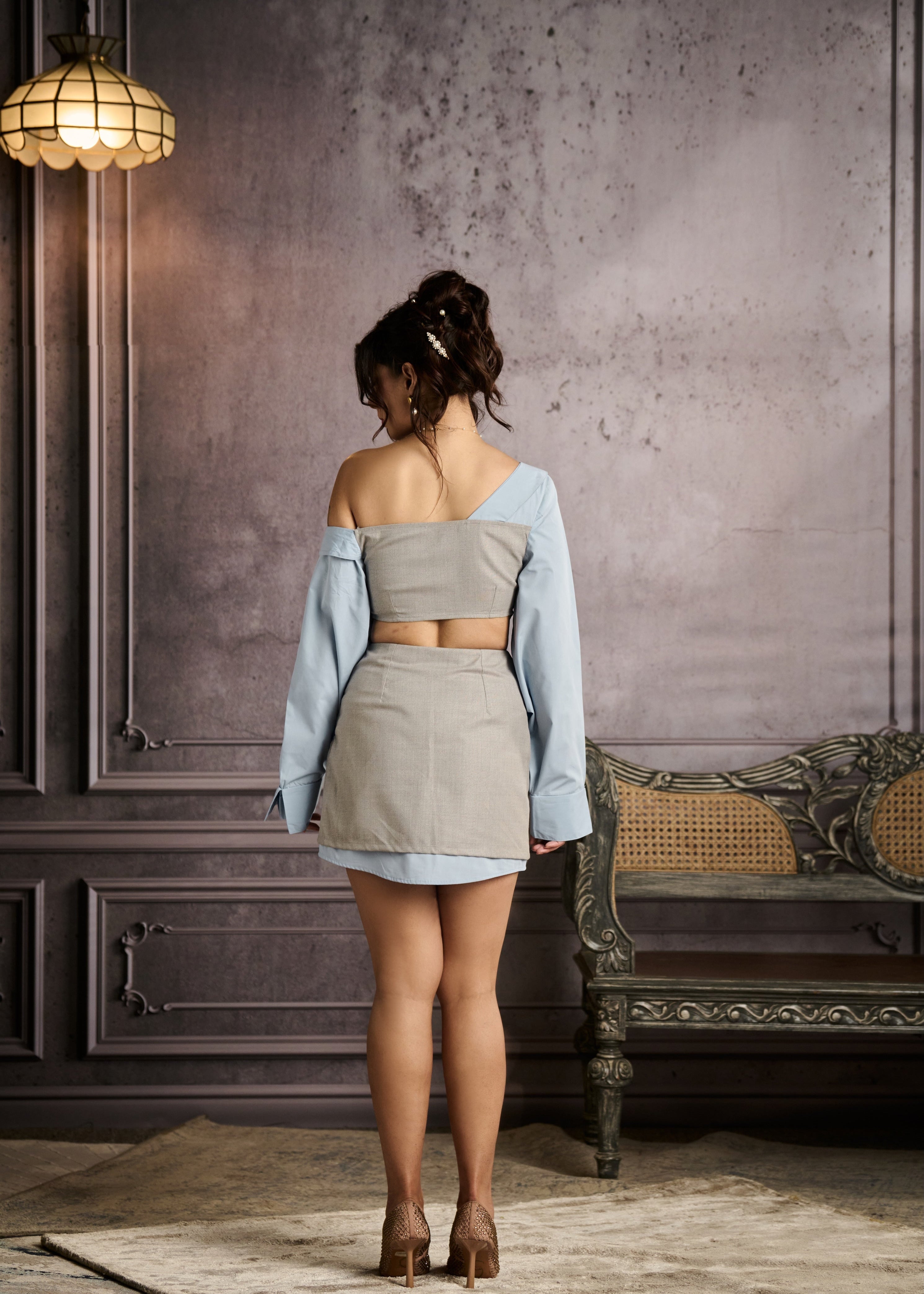 Fia Baby Blue and Grey Mini Skirt: Where Comfort Meets Cool. The combination of rich soft grey suiting fabric and baby blue poplin is simply stunning. The mini skirt with a high-waist silhouette is flattering. The double tiered hemline closure adds a touch of sophistication.