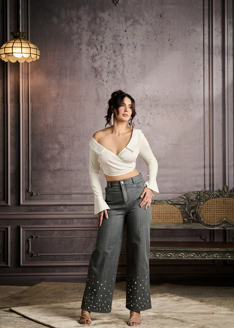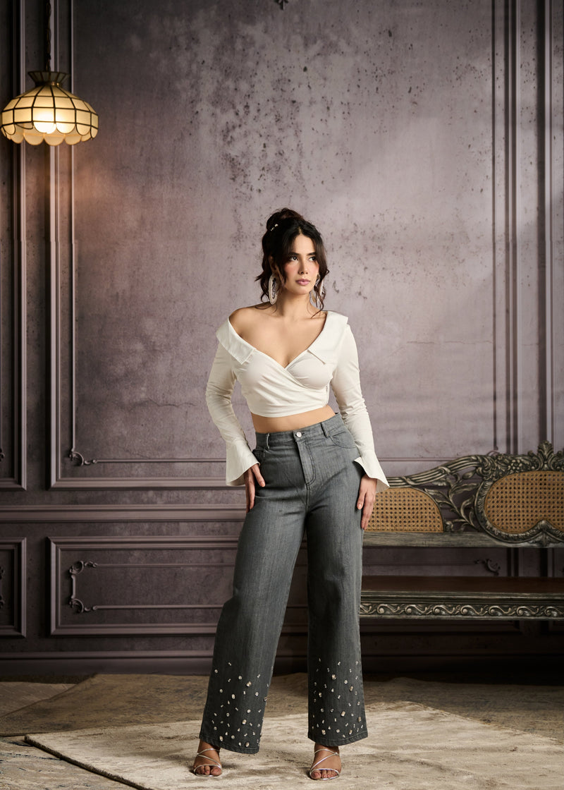 Cosima Grey High-Waisted Rhinestone Embellished Jeans