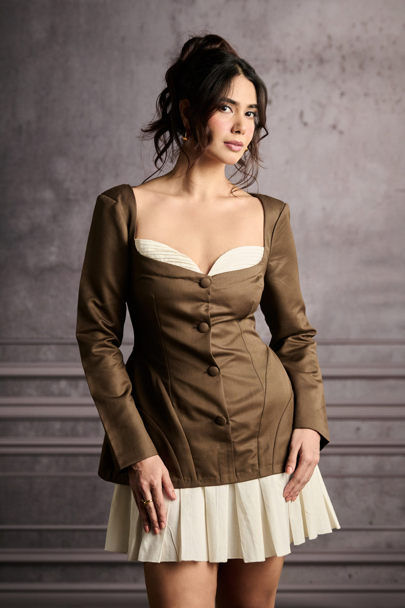Meet Nina Brown Sheath Dress with White Pleats, the dress that's as sweet as brown sugar and as chic as a Parisian café. Crafted from rich brown suiting fabric, Nina exudes warmth and elegance. The white poplin pleats add a touch of sweetness and a playful contrast to the brown. The exposed overbust detailing in a sweetheart manner adds a touch of romance with adorable fabric buttons in the center and pleat detailing towards the bottom. The cinching detailing at the back accentuates your curves.