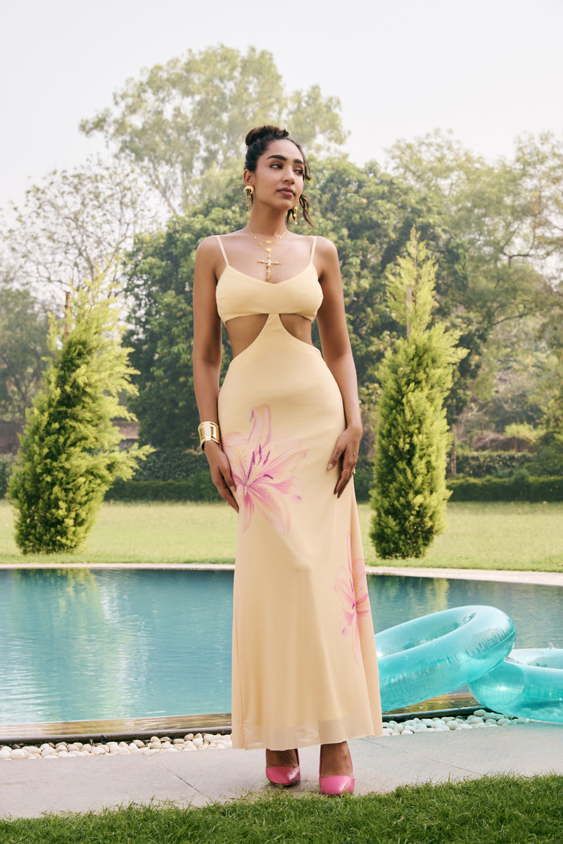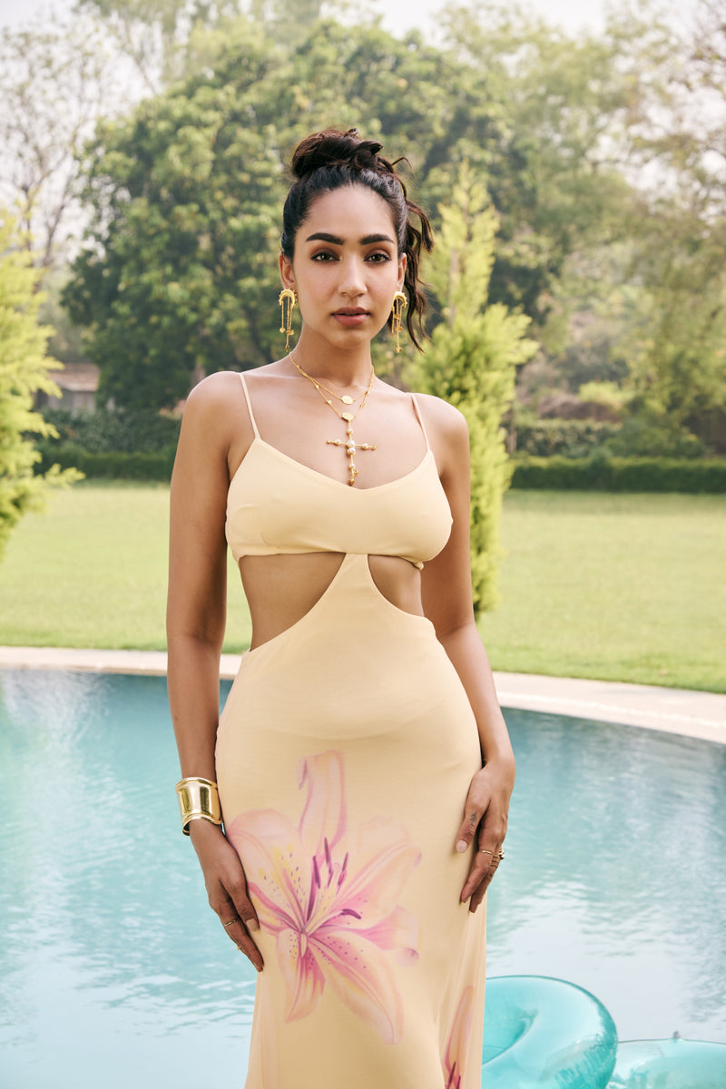 Up front, bold cut-out detailing adds a flirty twist, while the unique print placement brings a burst of personality and charm to every angle. A sleek side zipper ensures easy wear, so you can slip into Marigold and let the good vibes follow.