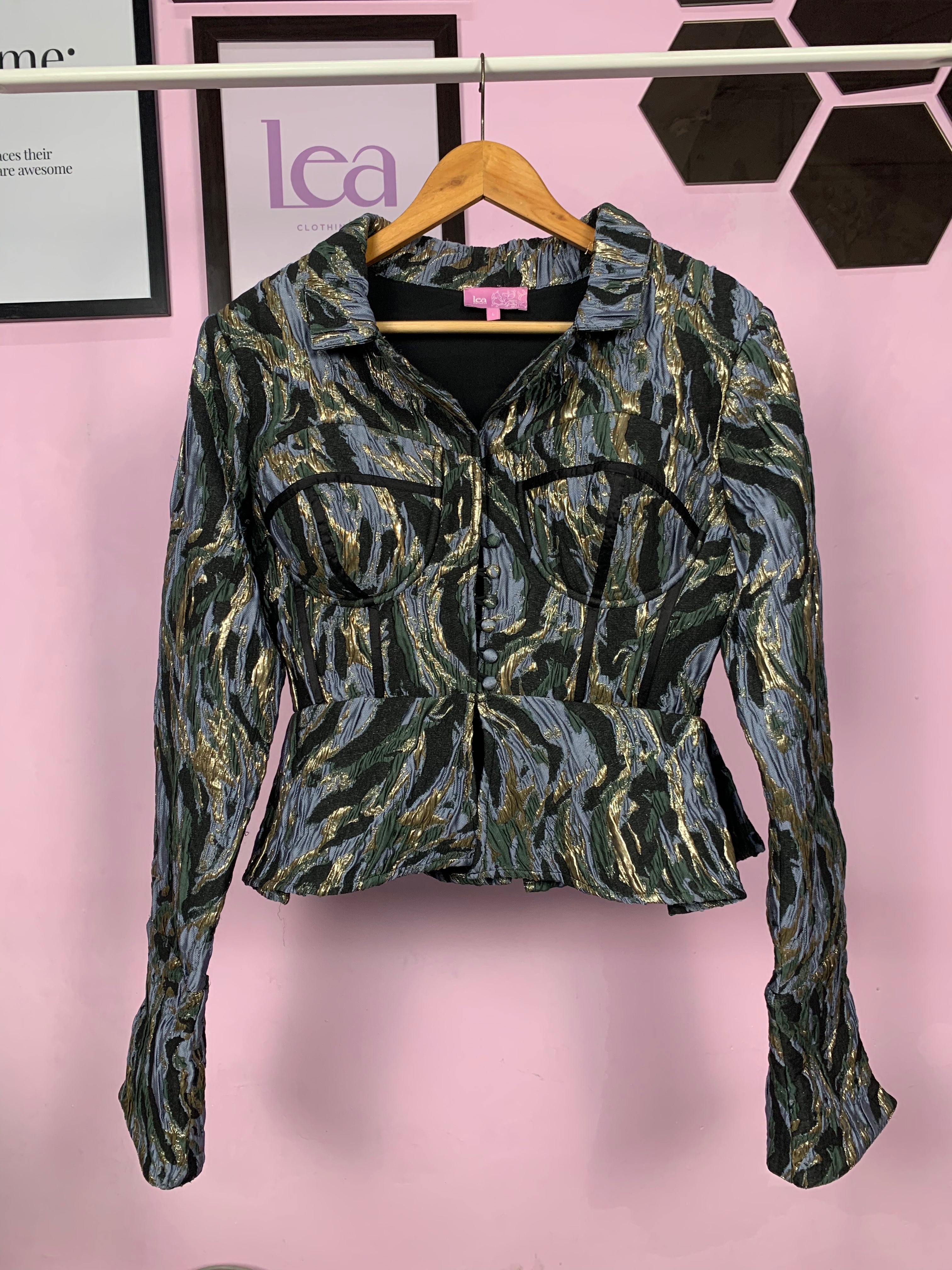 The Fit Sample of our Donna and Jessica Embroidered Jacquard Corset Blazer and Pants. Made with a rich, embroidered jacquard fabric, our Donna comes with our signature boned corsetry, bustier detailing, and a peplum silhouette. Our Jessica comes with a high-waisted, wide leg silhouette that perfectly hugs your curves.