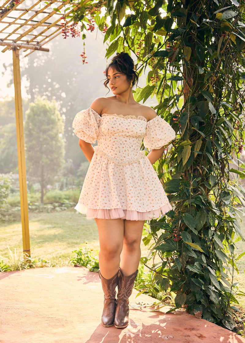 Cinched at the waist with gathered lace detailing, the A-line skirt flares out beautifully, revealing a peek of hardmesh underneath for that extra oomph. The off-shoulder puff sleeves—complete with elastic for comfort—bring just the right touch of whimsy, while the back loop tie closure with an inner flap keeps things effortlessly snug.
