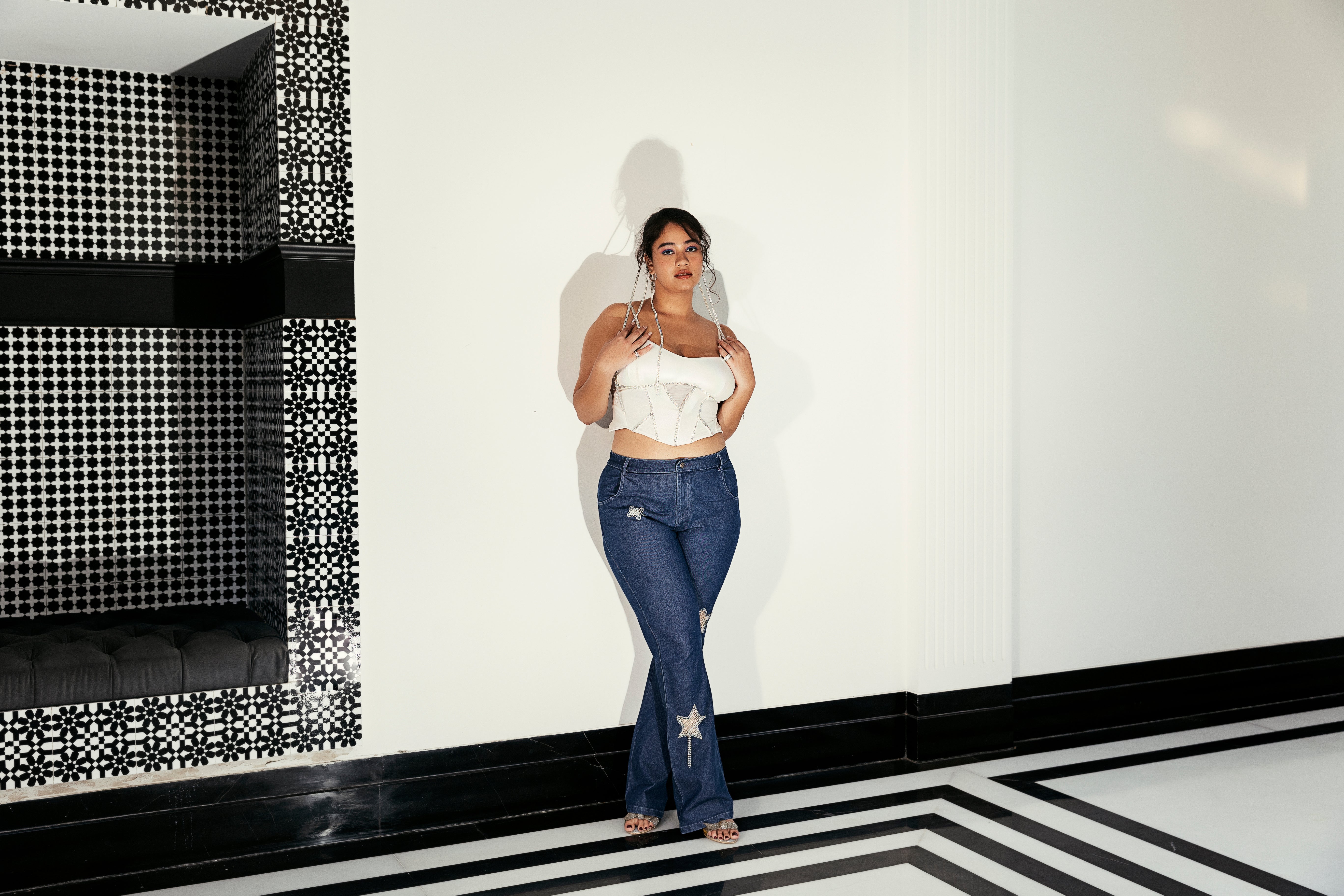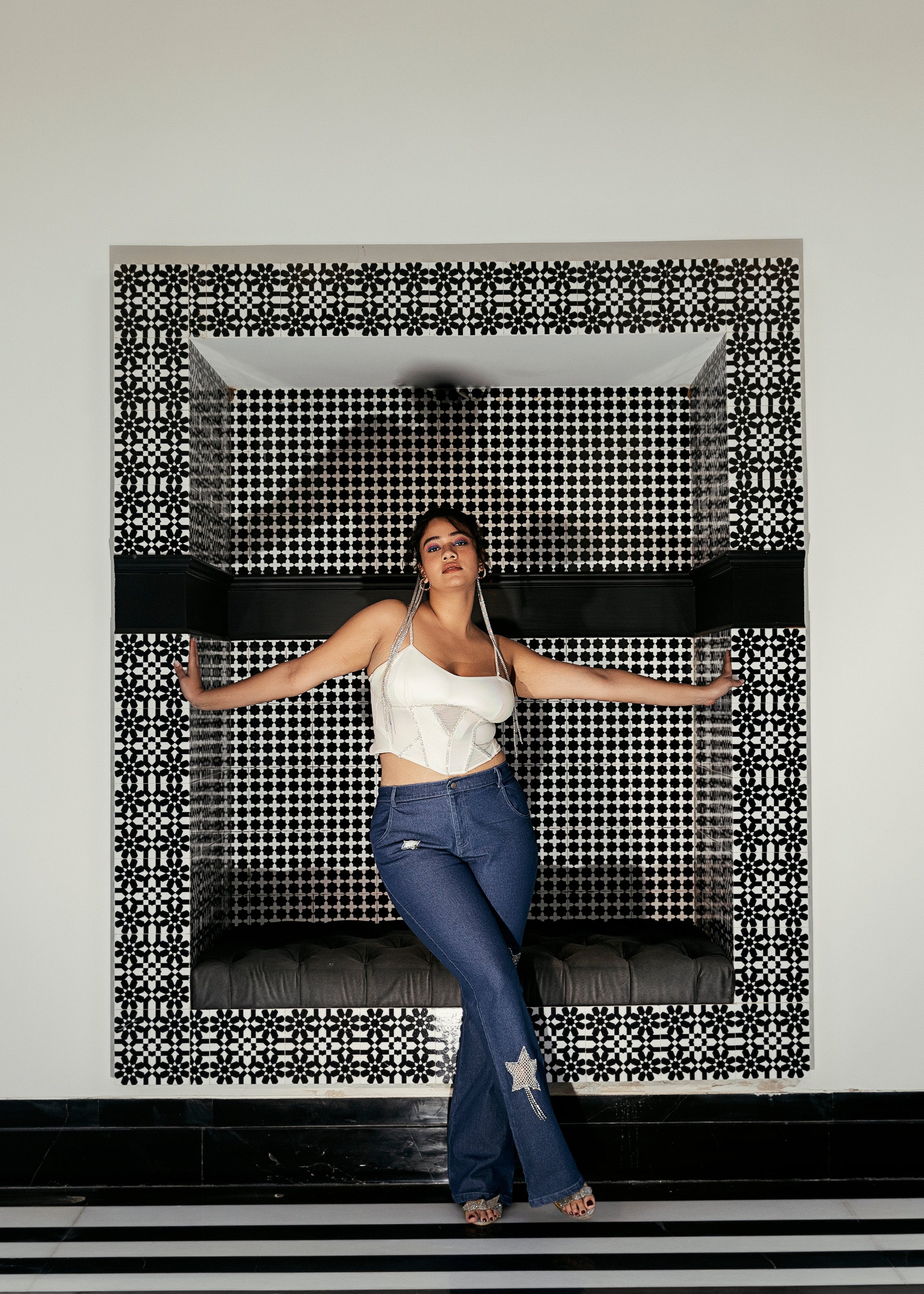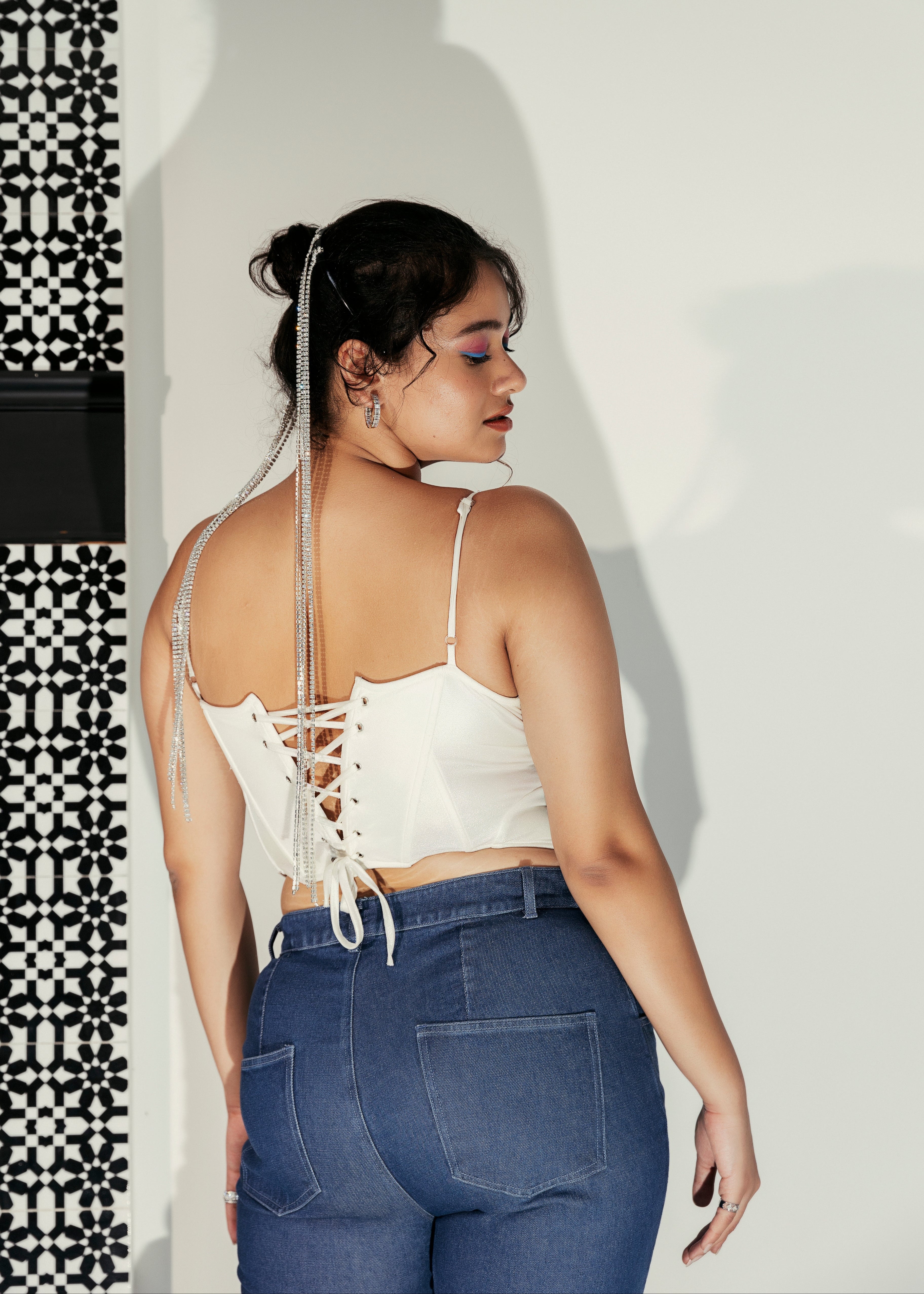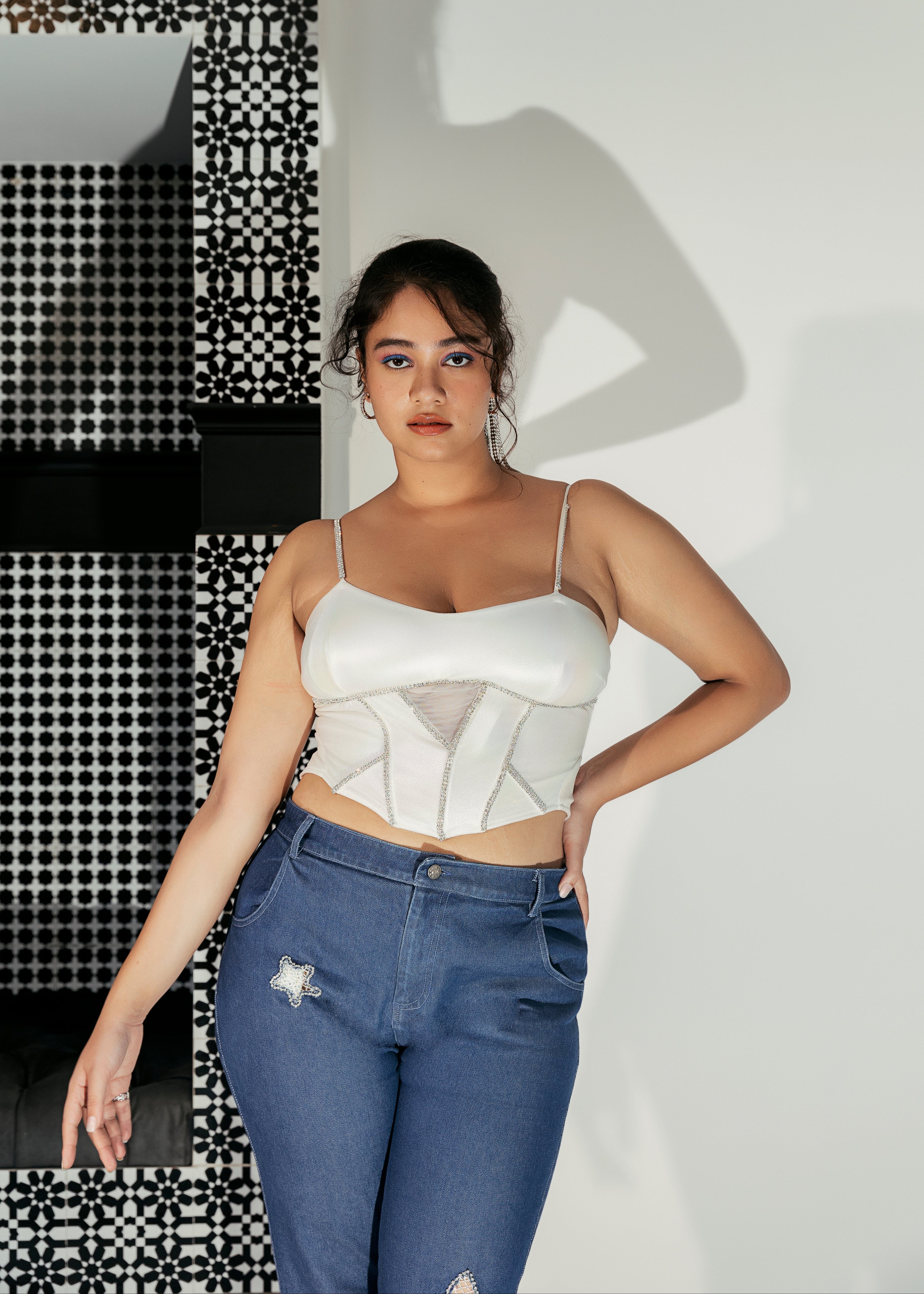 - Star-Shaped Cutouts Lined with White Crystal Mesh and Rhinestone Lace.