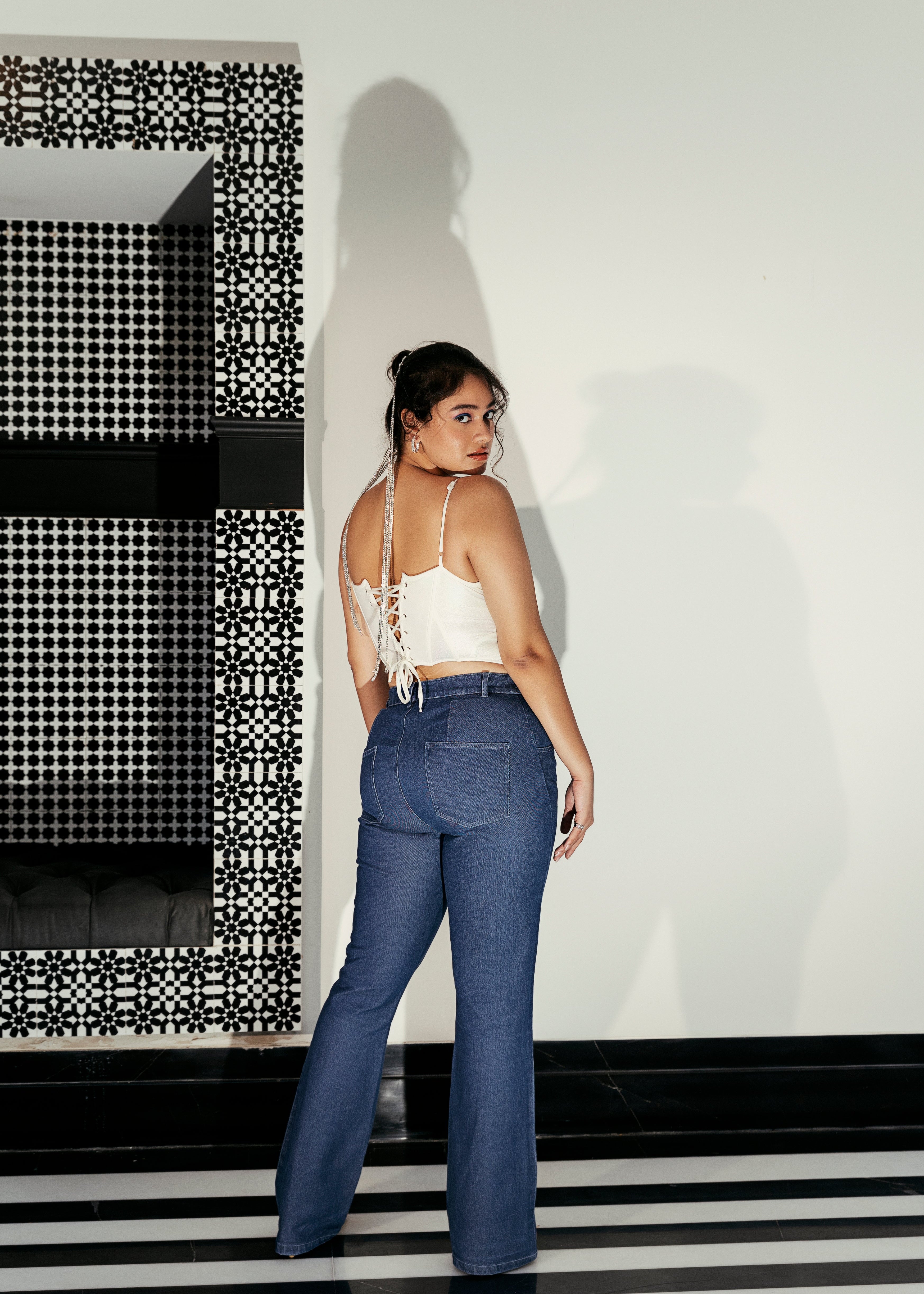 - Fit-and-Flare Style Jeans with High-Waisted Silhouette.
