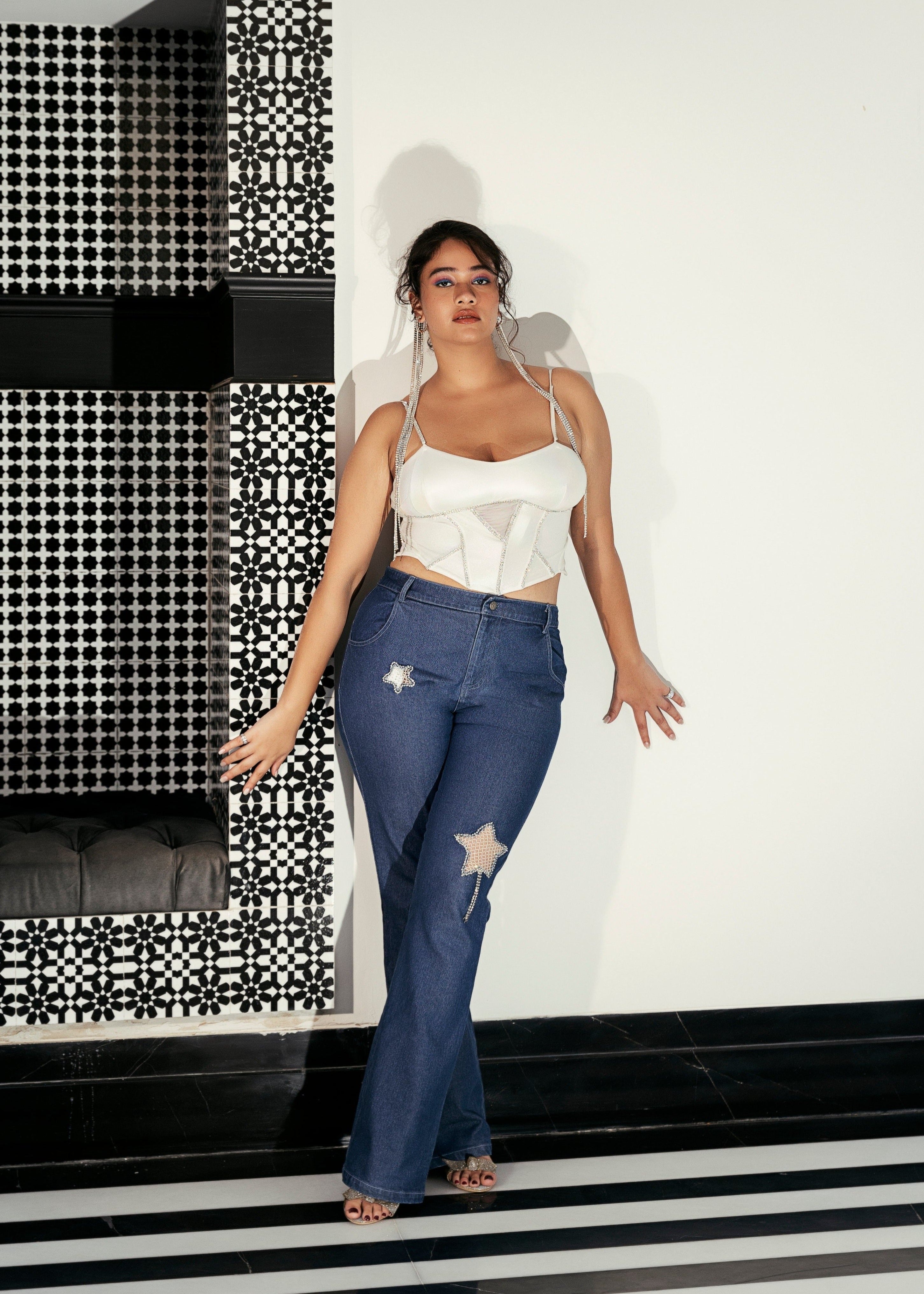 Our Maude Rhinestone Embroidered Flared Jeans are here to get you starry-eyed. Made with a soft, dark-wash, stretch denim fabric, our Maude comes in an uber-flattering fit-and-flare style with a high-waisted silhouette. The most adorable star-shaped cutouts lined with a dazzling white crystal mesh fabric along with matching rhinestone embroidery take the whole look to a whole other level!