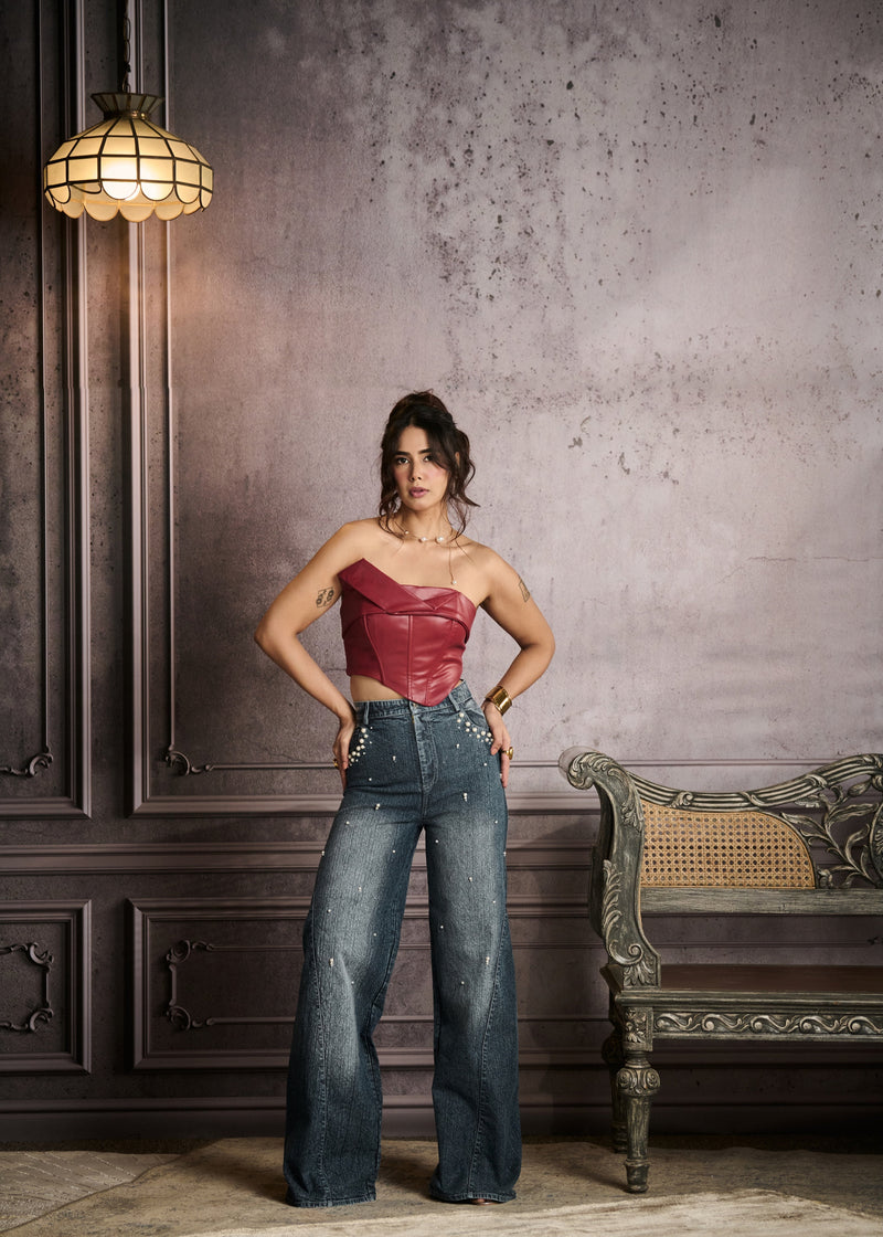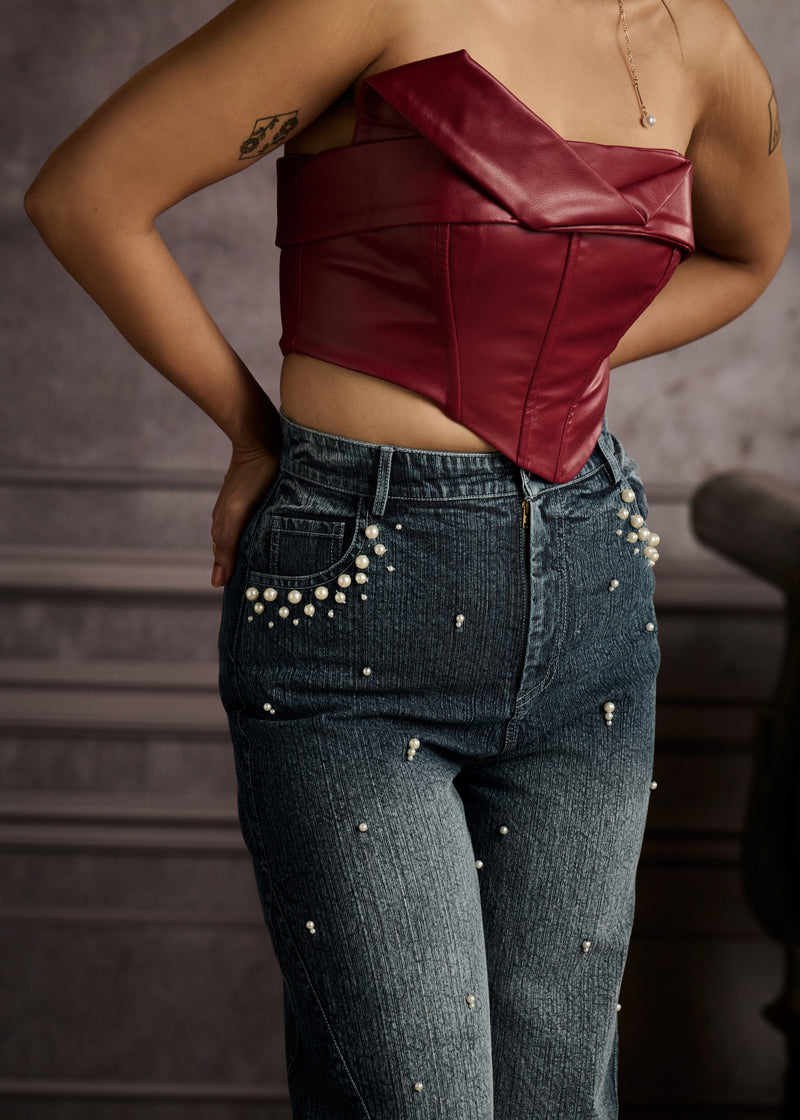 - High-waist Baggy Silhouette with Delicate Pearl Hand-embroidered.