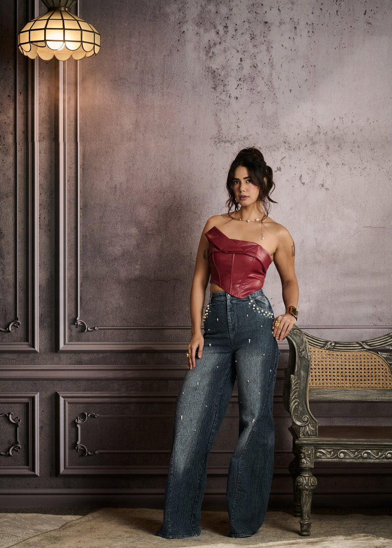 Crafted from the finest dark blue denim, Megan boasts a high-waist baggy silhouette that's both comfy and chic. But the real showstopper? The delicate pearl hand-embroidered detailing. It's a touch of luxury that's both unexpected and utterly divine. The intricate cut and sew detailing on the sides ensures you'll look as good as you feel.