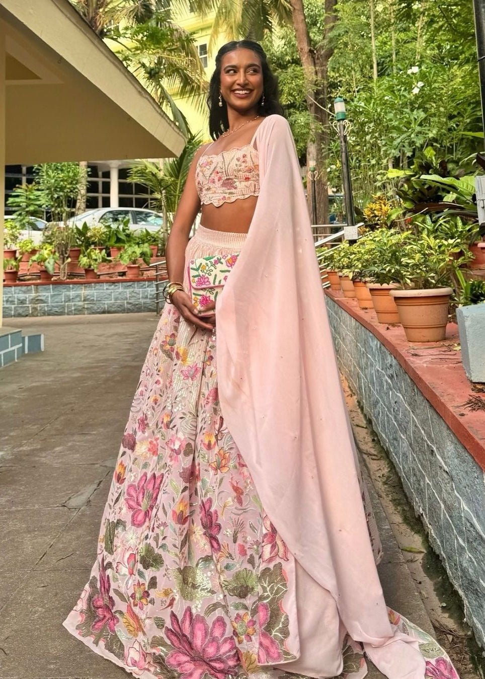 Calling all future lehenga legends! Ditch the ordinary and step into the extraordinary with the Ahaana Pink Floral Embroidered Lehenga, a lehenga that's got sass written all over it. A voluminous dream, crafted from the softest blush pink embellished and embroidered georgette and boasting intricate floral embroidery. It's like a fairytale come to life, with a side zipper closure for easy on-and-off. Made for maximum comfort and style, the blouse features a delicate scalloped neckline and hemline, with padding for added confidence (because who needs a wardrobe malfunction?). Adjustable straps and a charming eyelet closure with pearl latkans add the perfect finishing touches. No lehenga is complete without a stunning dupatta, and the Ahaana doesn't disappoint. It boasts gorgeous chita hand embroidery and embroidered edges, making it a true work of art.