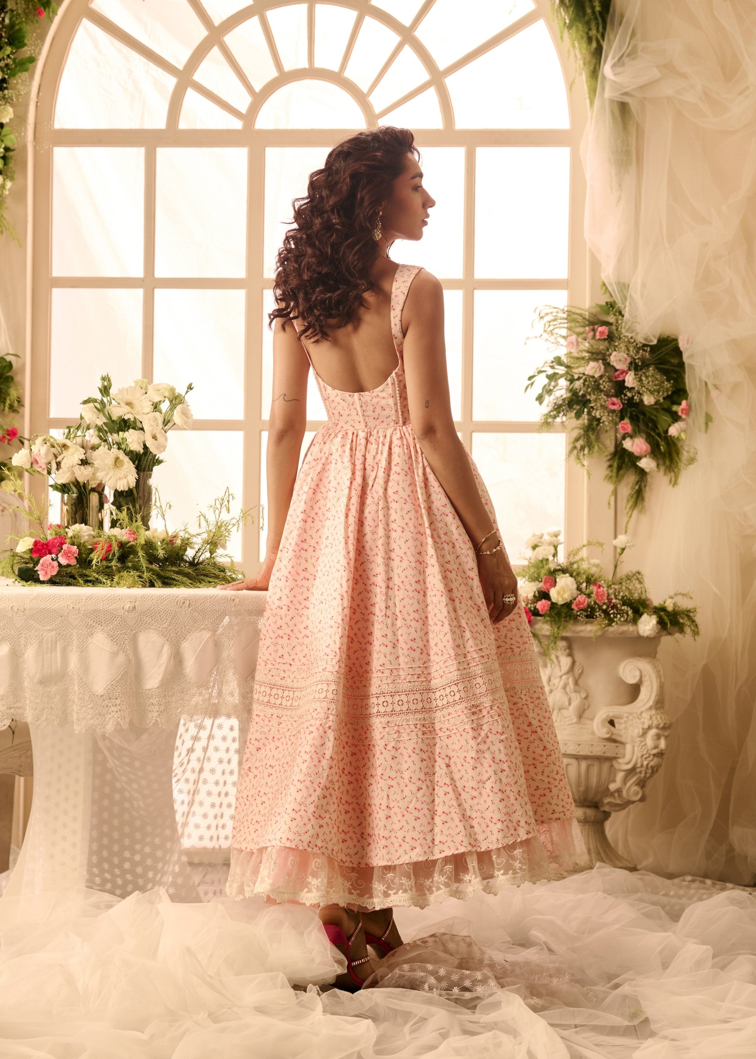Crafted from the softest baby pink cotton poplin, this floral printed corset maxi is a dream wrapped in fabric. With its intricate handwork, deep V-neckline laced with seduction, and a back that dares to be bare (in the classiest way possible), Carmine is the epitome of feminine allure. And don’t even get us started on our signature boned corsetry – it’s like a secret weapon for your confidence. The hemline is the cherry on top, featuring layered laces that echo the bodice’s intricate design. And did we mention the concealed side zipper? It’s our little secret to keep you looking flawless.