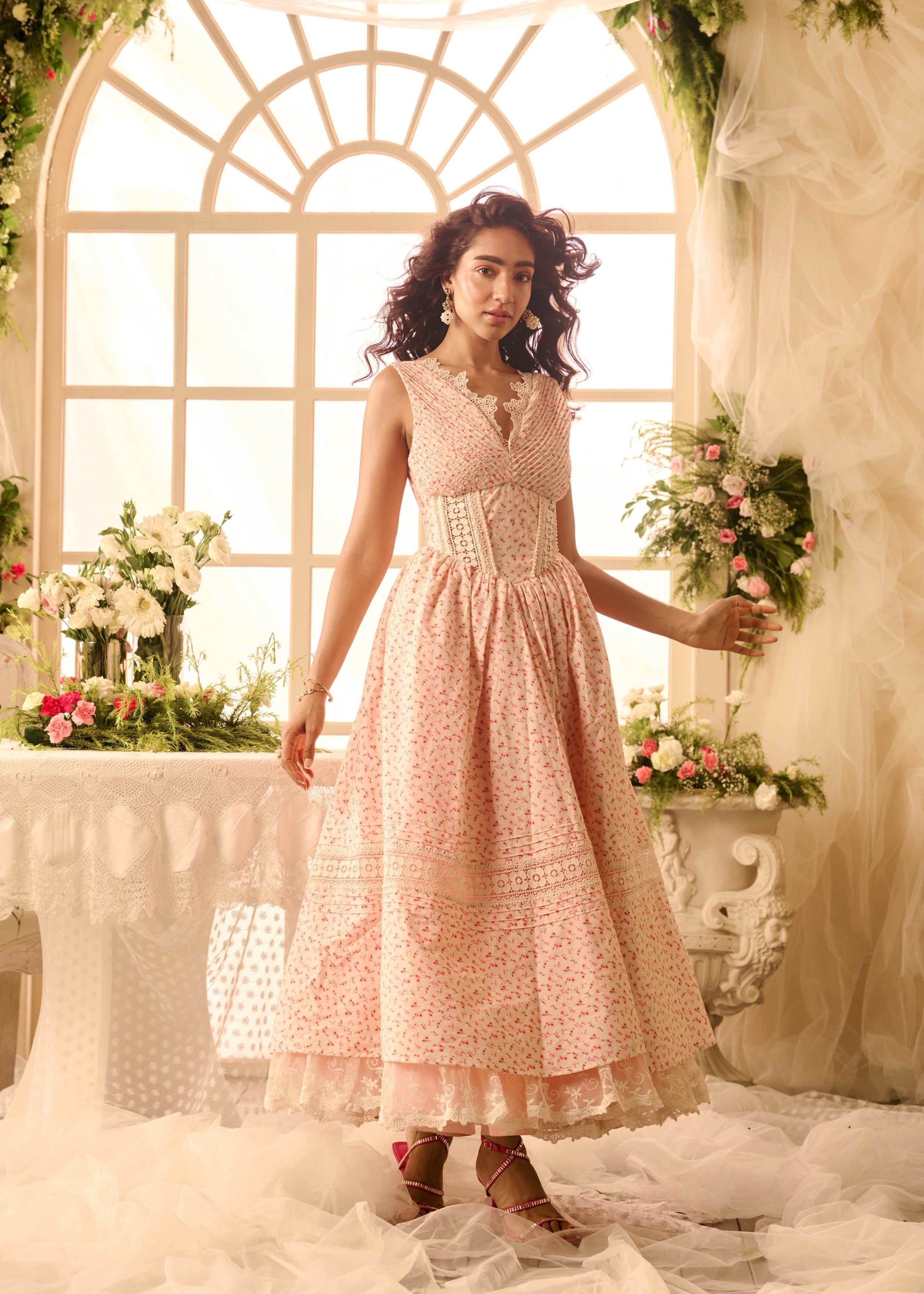 Carmine Baby Pink Floral Printed Corset Maxi Dress