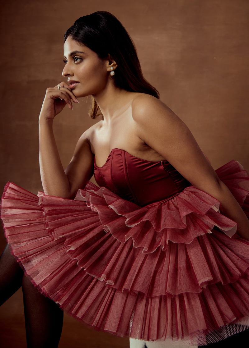 - Made with Burgundy Japanese Satin and Soft and Hard Tulle. Fully Lined.