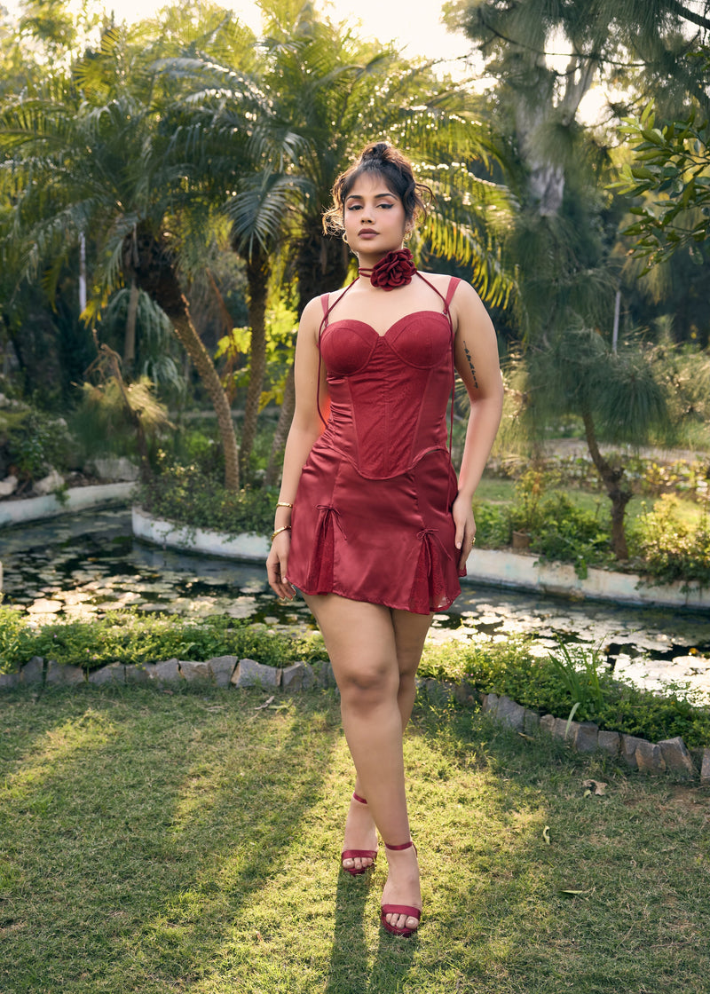 When drama meets flirt, you get the Davina Red A-Line Mini Skirt—a statement piece that's as bold as your confidence! Crafted from rich red satin with delicate lace fabric inserts, this skirt is an irresistible mix of sultry and sweet. It’s lined with poly crepe for ultimate comfort, so you can slay the day (or night) in style. Designed with an A-line silhouette for that effortlessly chic vibe. Features pleats accented with lace inserts and a flirty bow detail that’s all about the *main character energy*. A side concealed zipper keeps the focus exactly where it should be—on you.