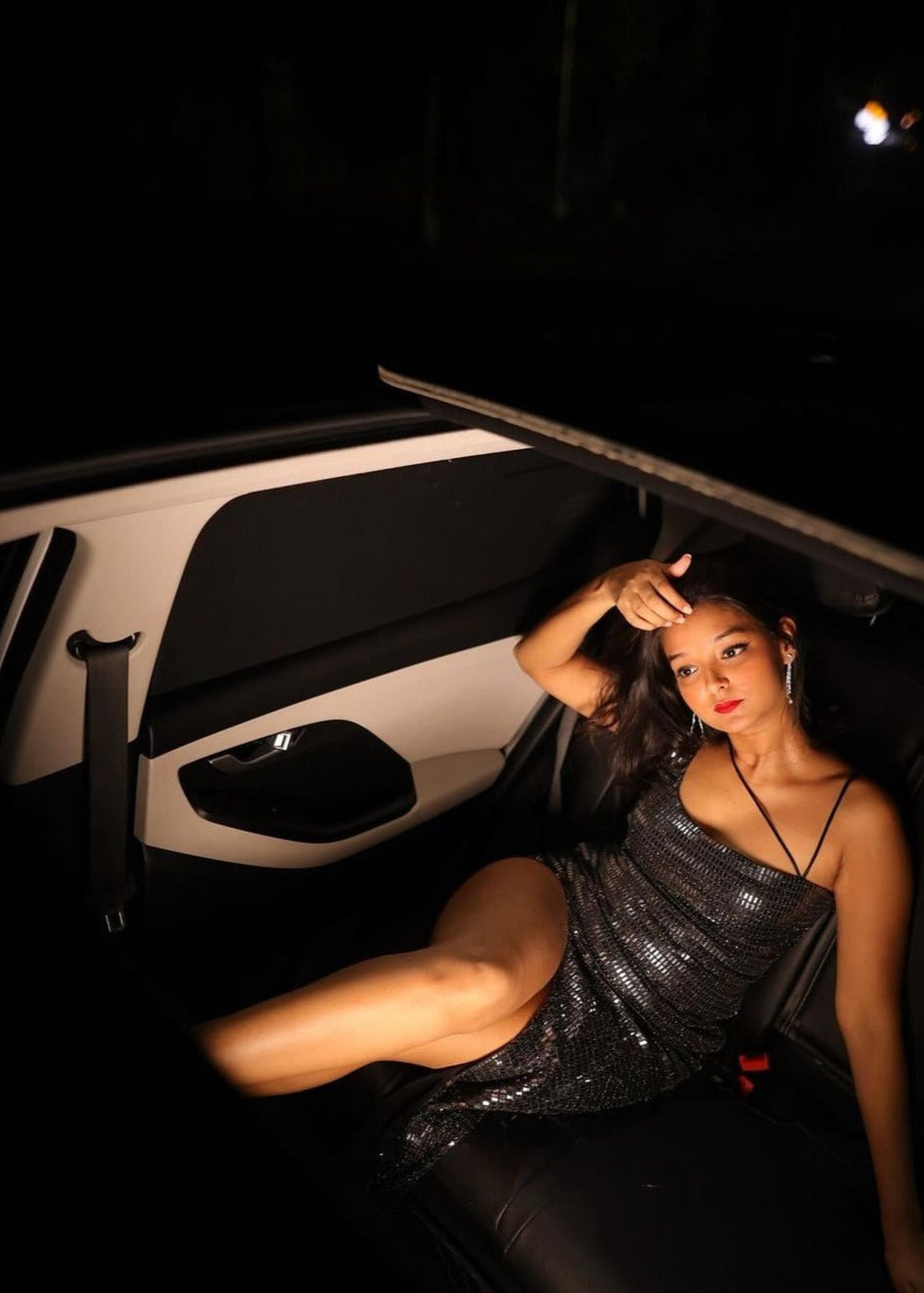 Get ready to make heads turn in our Santana Black Shine Cutout Gown. Made with a luxurious, black, stretch, embellished fabric, our Santana comes in an uber-flattering bodycon silhouette with a scoop neckline, asymmetrical noodle straps, and an elasticated, cutout back. A floor-length skirt with a statement cutout in the front completes this sumptuous look!