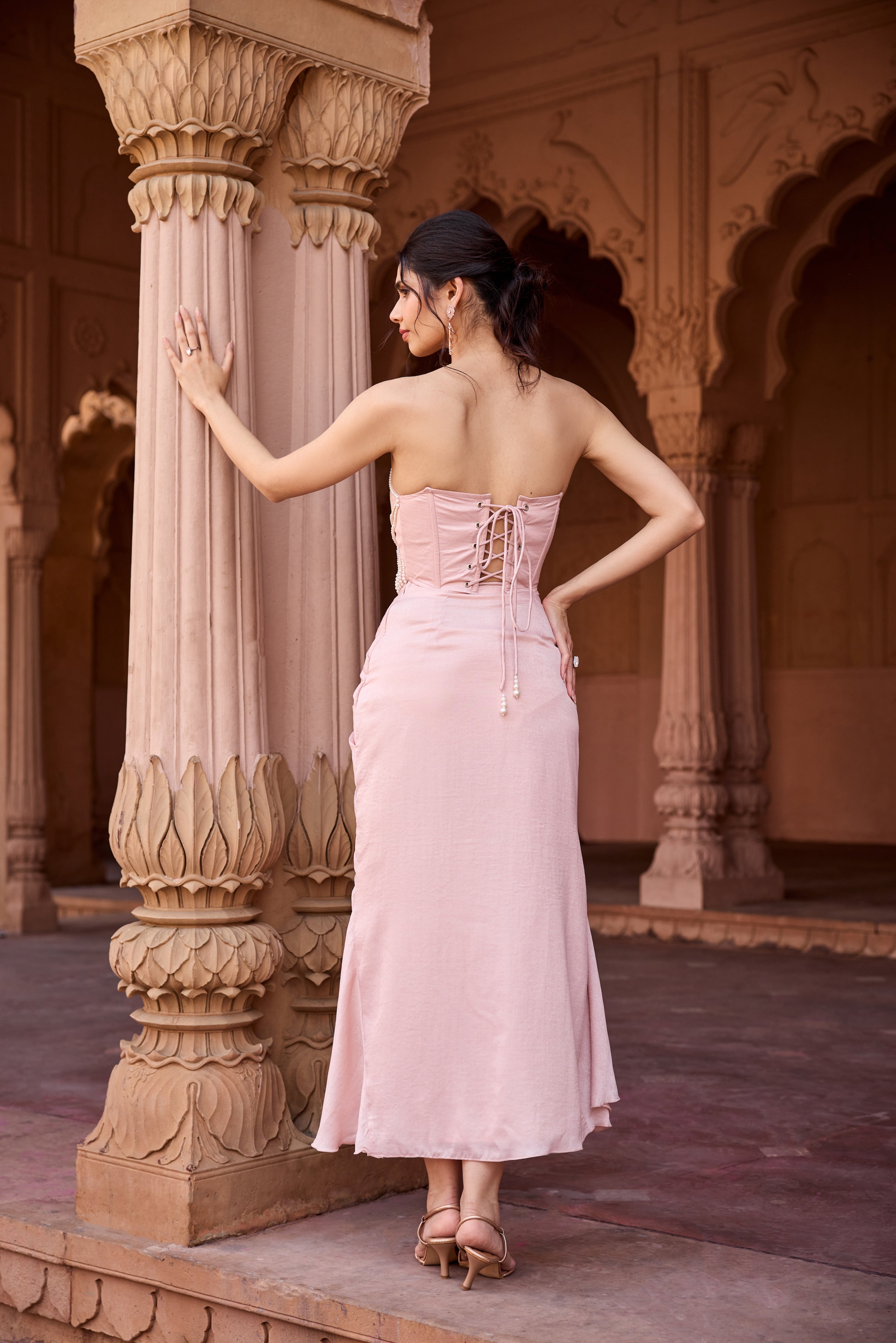 Crafted with luxurious baby pink foil print satin and lined with smooth poly crepe, the Misha coord set features a show-stopping pearl embellished top with our signature boned corsetry and a back lace-up for the corset ensuring a perfect fit. A beautifully draped skirt with elegant embroidery and artful drapery create a silhouette that's both captivating and flattering. The pièce de résistance? A full-length cape made of delicate embroidered organza, adding a touch of ethereal charm. Function meets fabulous with a discreet side zipper for the skirt.
