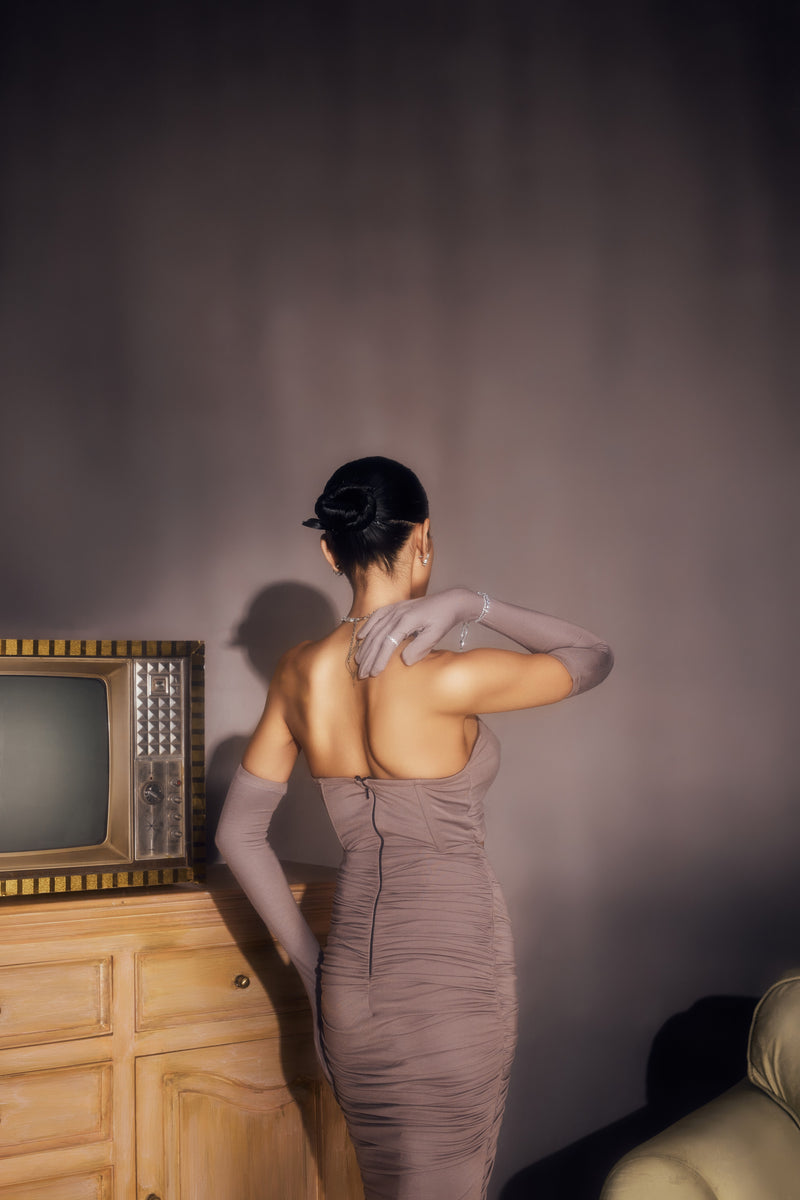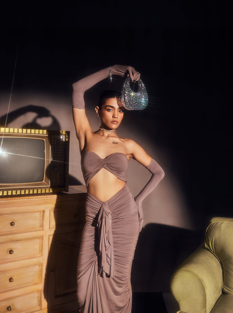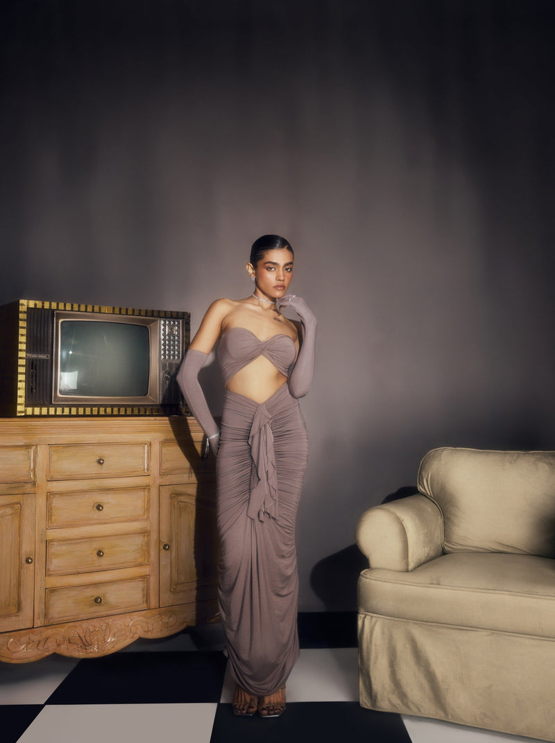 Introducing our Tulip Taupe Modal Ruched Bodycon Maxi Dress, a true embodiment of luxury and sophistication. Immerse yourself in the unparalleled comfort of the softest poly-modal lycra fabric in the color of the season, that's made to hug and accentuate every inch of your curves. The ruched bodycon design ensures a flattering fit, with the strapless bustier detailing (with in-built padding for that perfect fit) that adds a touch of glamour to this timeless piece. The strategically placed cutout in the front creates a subtle yet alluring focal point, making a bold statement at any upscale event. the cascading ruffles down the front add a romantic flair to the outfit, and the matching gloves seamlessly blend with the dress' aesthetic!