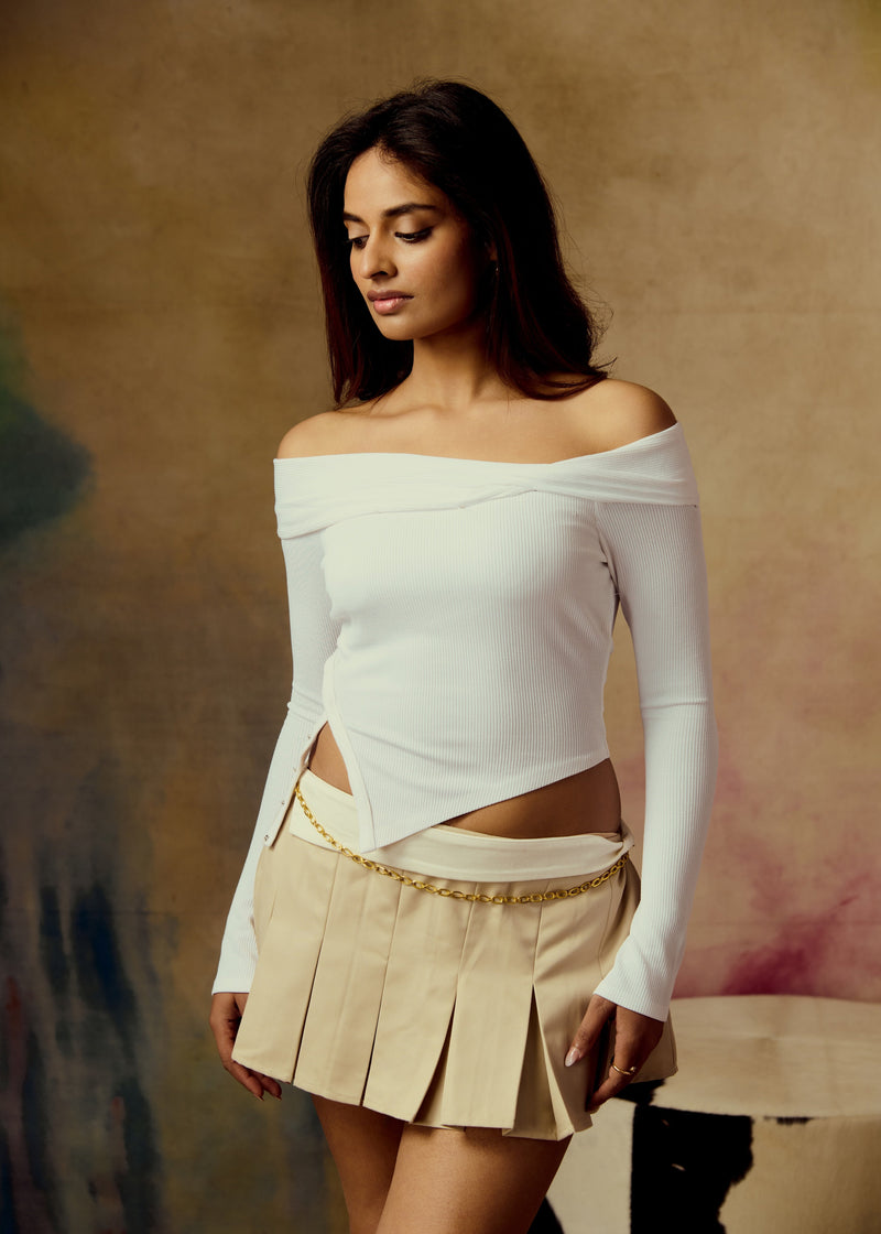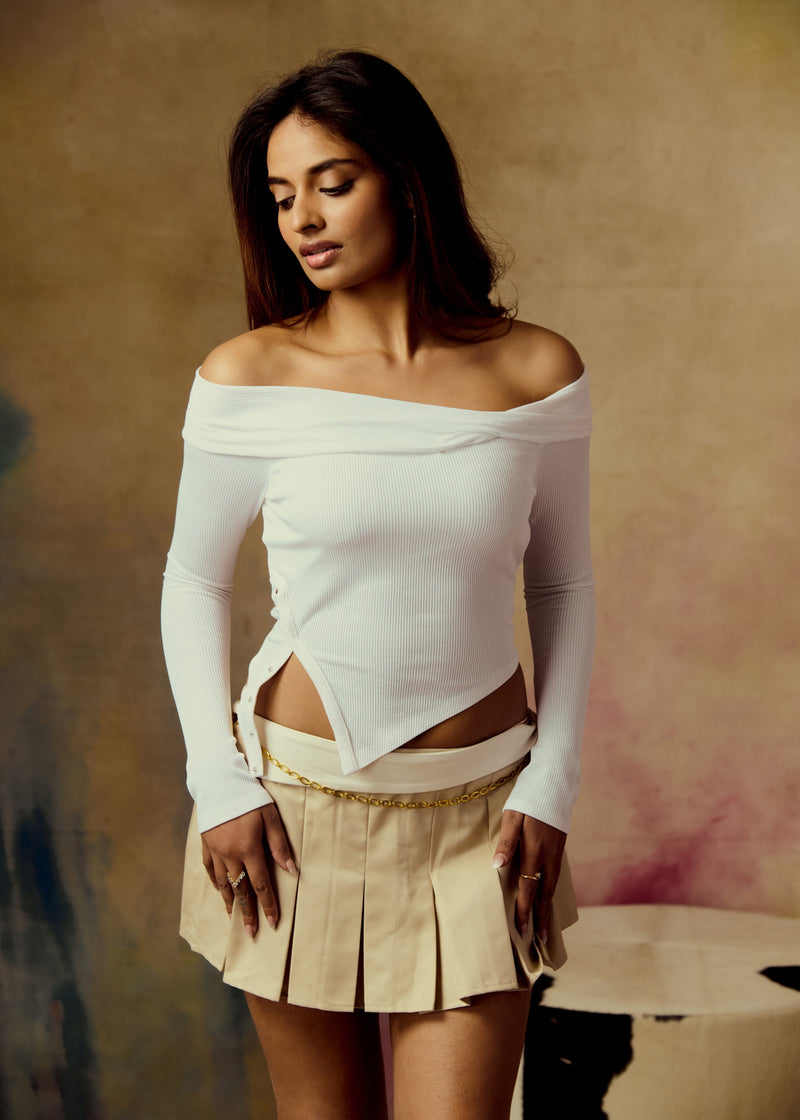 When in doubt, twist it out! The Beryl White Ribbed Off-Shoulder Top is here to make sure your style game stays one step ahead. Crafted in the softest Mario rib fabric that feels like a second skin, this top is a minimalist must-have with a playful twist — literally! Featuring an off-shoulder neckline with a chic twist detail, full sleeves, and snap buttons at the waist for an edgy finish, this one’s designed to bring main character energy to any look.